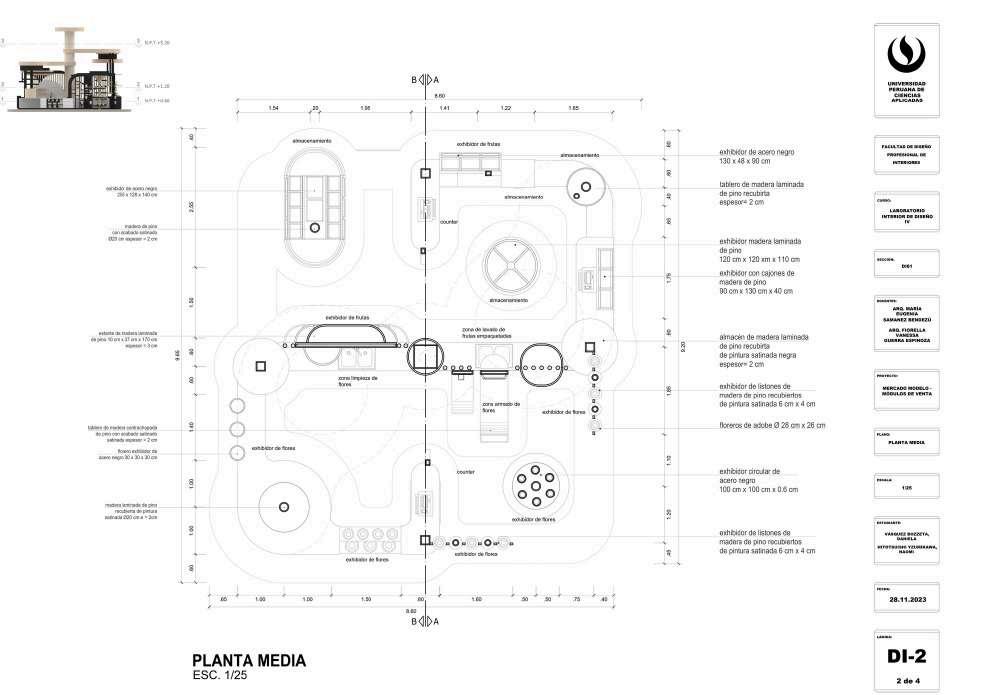 El proyecto consistió en el rediseño de los módulos de venta del Mercado Modelo 28 de Julio, centrándose específicamenteendospuestoscontiguos:unodedicadoalaventadefloresyotroalaventadefrutas Paraello se visitó la edificación y se recopiló información técnica teniendo en cuenta tanto su relación con el exterior (ubicación y clima) como con el interior esto refiriéndose a los usuarios: vendedores y compradores. Para tener un mejor conocimiento de ambos se realizaron entrevistas sobre su relación con el mercado, consiguiendo así informaciónqueseregistróenfichasdeusuarioyjourneymaps Dichadatarecopiladasirvióparacrearundiseño demódulosmásviableyfuncional.