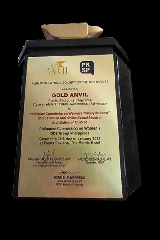 The Philippine Commission on Women (PCW) and DDB Group Philippines were honored with a Gold Anvil Award at the prestigious 60th Anvil Awards for their impactful short films highlighting the issue of Online Sexual Abuse and Exploitation of Children (OSAEC). The award, presented in the Public Relations Programs - Cause Related/Public Awareness/Advocacy category, recognizes exceptional campaigns that raise awareness, foster positive change, and inspire action for critical social causes. Organized annually by the Public Relations Society of the Philippines (PRSP), the Anvil Awards is regarded as the “Oscars of PR” in the country.