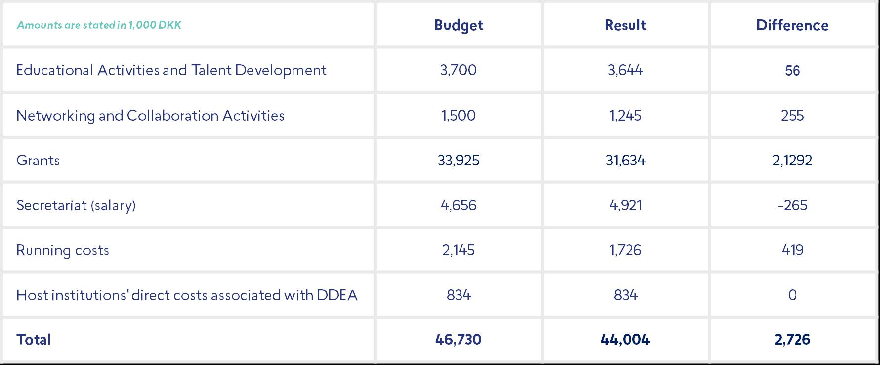 The financial results for 2024 show an expenditure of TDKK 44.004 against a budgeted expenditure of TDKK 46 761 resulting in a lower-than-expected expenditure of TDKK 2 761 (Table 1)