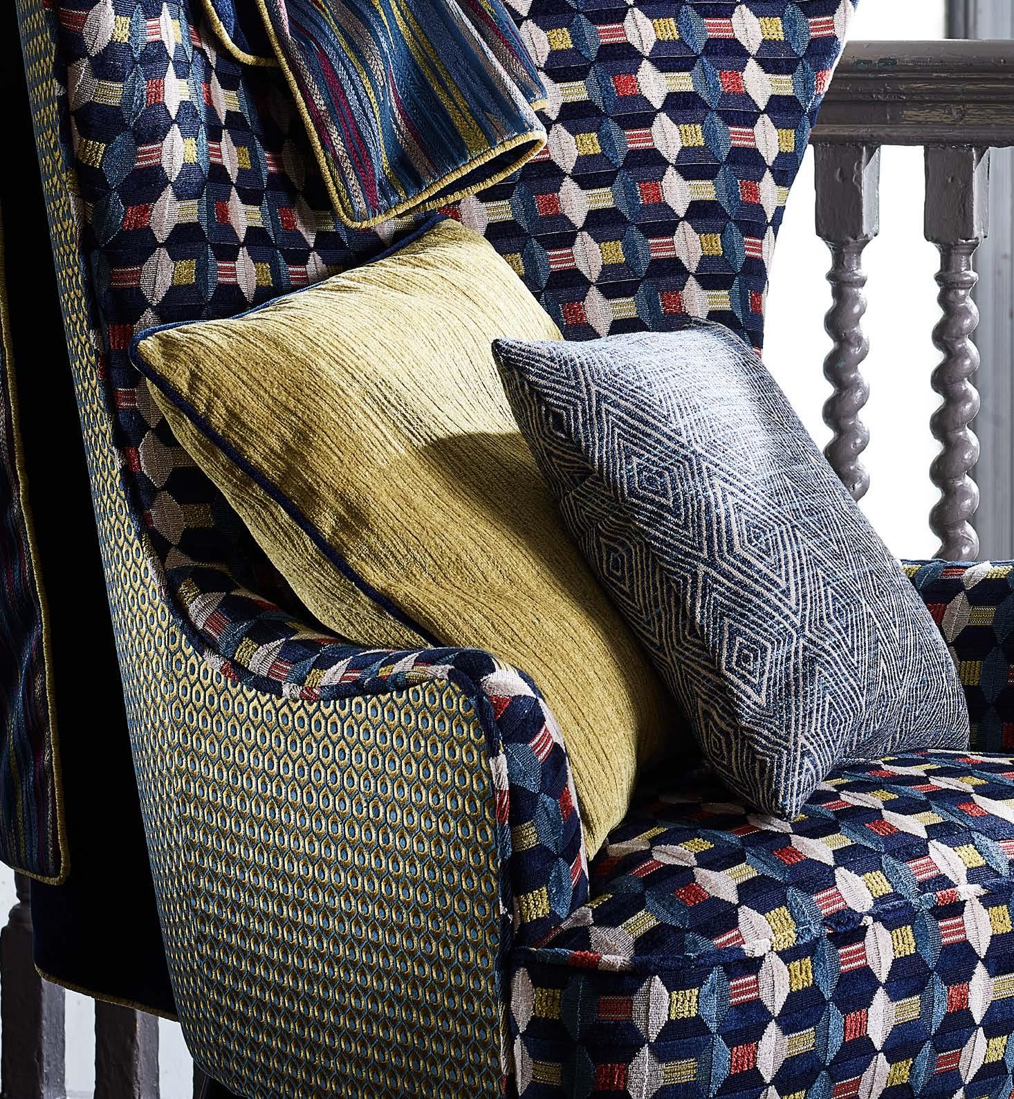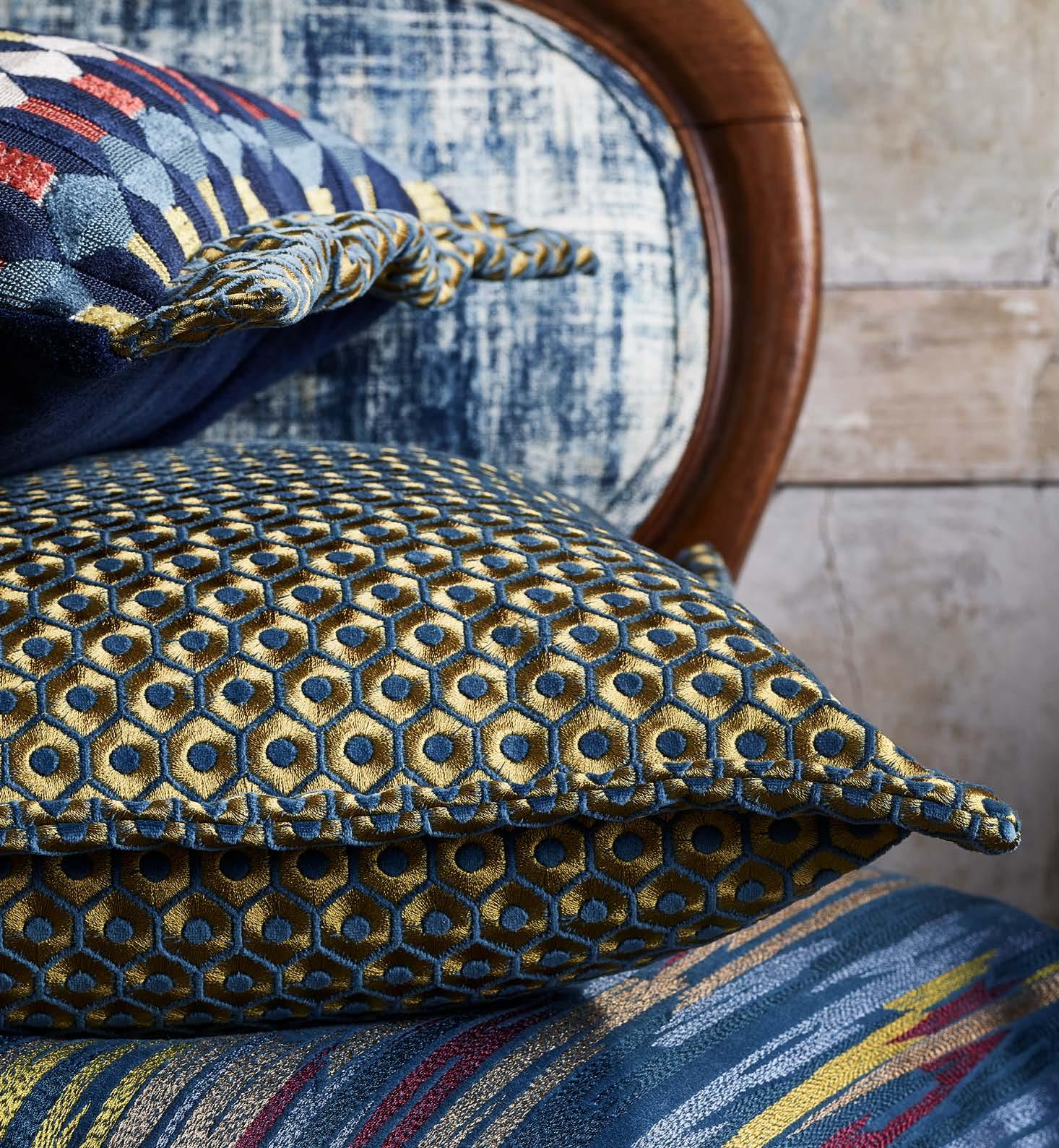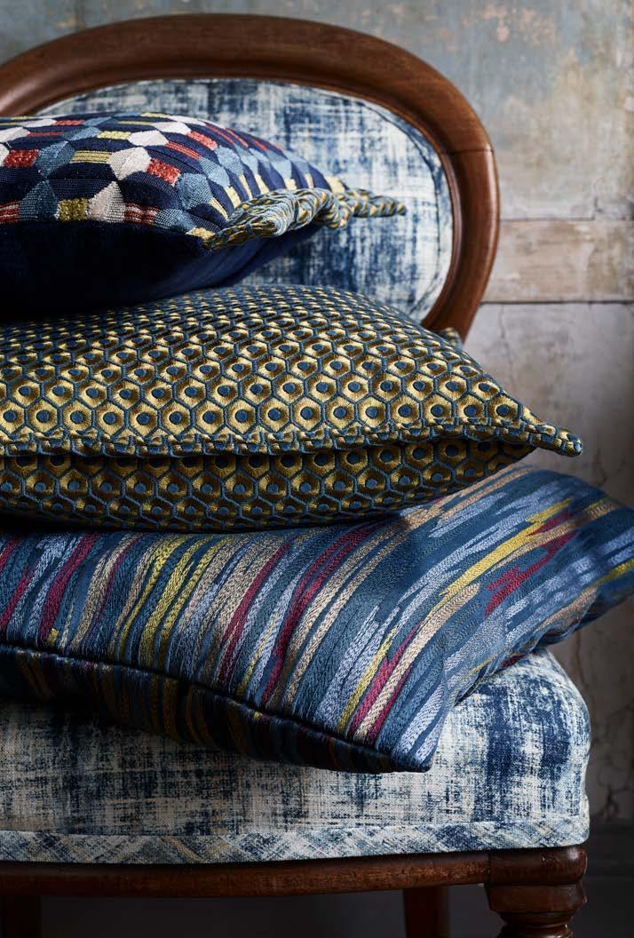 Malabar is nestled together with smart geometric velvets, wovens and rich embroideries.