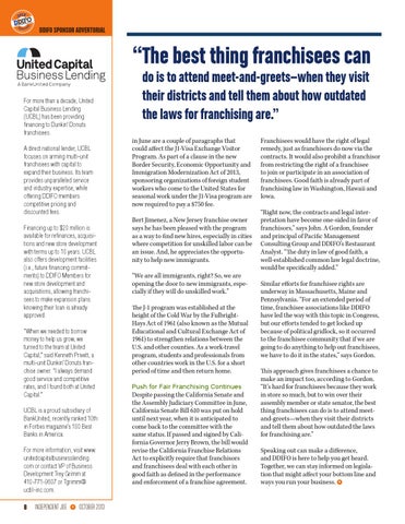 in June are a couple of paragraphs that could affect the J1-Visa Exchange Visitor Program. As part of a clause in the new Border Security, Economic Opportunity and Immigration Modernization Act of 2013, sponsoring organizations of foreign student workers who come to the United States for seasonal work under the J1-Visa program are now required to pay a $750 fee. Bert Jimenez, a New Jersey franchise owner says he has been pleased with the program as a way to find new hires, especially in cities where competition for unskilled labor can be an issue. And, he appreciates the opportunity to help new immigrants. “We are all immigrants, right? So, we are opening the door to new immigrants, especially if they will do unskilled work.” The J-1 program was established at the height of the Cold War by the FulbrightHays Act of 1961 (also known as the Mutual Educational and Cultural Exchange Act of 1961) to strengthen relations between the U.S. and other counties. As a work-travel program, students and professionals from other countries work in the U.S. for a short period of time and then return home. Push for Fair Franchising Continues Despite passing the California Senate and the Assembly Judiciary Committee in June, California Senate Bill 610 was put on hold until next year, when it is anticipated to come back to the committee with the same status. If passed and signed by California Governor Jerry Brown, the bill would revise the California Franchise Relations Act to explicitly require that franchisors and franchisees deal with each other in good faith as defined in the performance and enforcement of a franchise agreement.