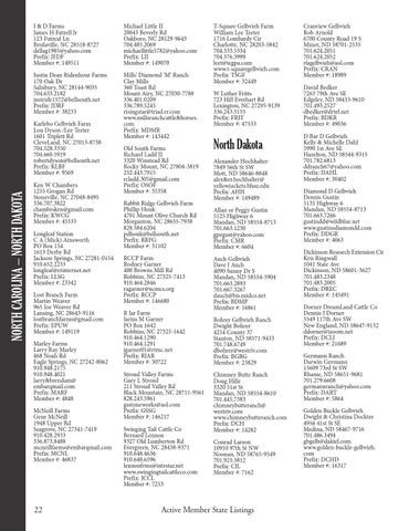 Old South Farms Richard Ladd II 3320 Winstead Rd Rocky Mount, NC 27804-3819 252.443.7915 rcladd.305@gmail.com Prefix: OSOF Member #: 35358 Rabbit Ridge Gelbvieh Farm Phillip Houk 4701 Mount Olive Church Rd Morganton, NC 28655-7938 828.584.6204 pdhouk@bellsouth.net Prefix: RRFG Member #: 31102 RCCP Farm Rodney Garner 400 Browns Mill Rd Robbins, NC 27325-7413 910.464.2846 ragarner@ncmcs.org Prefix: RCCP Member #: 146680 R Jar Farm Jarius M Garner PO Box 1642 Robbins, NC 27325-1642 910.464.1290 910.464.1291 jgarner01@rtmc.net Prefix: RJAR Member #: 30722 Stroud Valley Farms Gary L Stroud 211 Stroud Valley Rd Black Mountain, NC 28711-9561 828.243.5961 gsstoneworks@aol.com Prefix: GSSG Member #: 146217 Swinging Tail Cattle Co Bernard Lennon 9327 Old Lumberton Rd Evergreen, NC 28438-9371 910.648.4636 910.648.6596 lennonfrms@intrstar.net www.swingingtailcattleco.com Prefix: JCCL Member #: 7253
