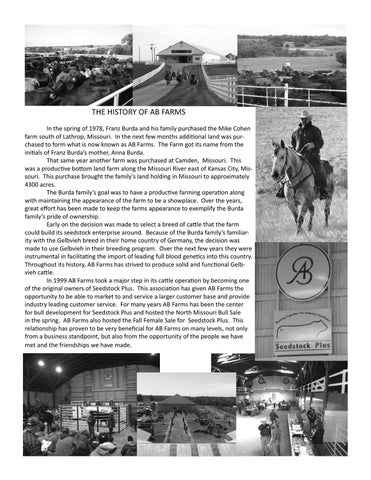 THE HISTORY OF AB FARMS In the spring of 1978, Franz Burda and his family purchased the Mike Cohen farm south of Lathrop, Missouri. In the next few months additional land was purchased to form what is now known as AB Farms. The Farm got its name from the initials of Franz Burda’s mother, Anna Burda. That same year another farm was purchased at Camden, Missouri. This was a productive bottom land farm along the Missouri River east of Kansas City, Missouri. This purchase brought the family’s land holding in Missouri to approximately 4300 acres. The Burda family’s goal was to have a productive farming operation along with maintaining the appearance of the farm to be a showplace. Over the years, great effort has been made to keep the farms appearance to exemplify the Burda family’s pride of ownership. Early on the decision was made to select a breed of cattle that the farm could build its seedstock enterprise around. Because of the Burda family’s familiarity with the Gelbvieh breed in their home country of Germany, the decision was made to use Gelbvieh in their breeding program. Over the next few years they were instrumental in facilitating the import of leading full blood genetics into this country. Throughout its history, AB Farms has strived to produce solid and functional Gelbvieh cattle. In 1999 AB Farms took a major step in its cattle operation by becoming one of the original owners of Seedstock Plus. This association has given AB Farms the opportunity to be able to market to and service a larger customer base and provide industry leading customer service. For many years AB Farms has been the center for bull development for Seedstock Plus and hosted the North Missouri Bull Sale in the spring. AB Farms also hosted the Fall Female Sale for Seedstock Plus. This relationship has proven to be very beneficial for AB Farms on many levels, not only from a business standpoint, but also from the opportunity of the people we have met and the friendships we have made.