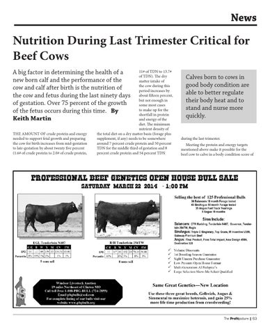 Nutrition During Last Trimester Critical for Beef Cows A big factor in determining the health of a new born calf and the performance of the cow and calf after birth is the nutrition of the cow and fetus during the last ninety days of gestation. Over 75 percent of the growth of the fetus occurs during this time. By Keith Martin THE AMOUNT OF crude protein and energy needed to support fetal growth and preparing the cow for birth increases from mid-gestation to late-gestation by about twenty five percent (1.6# of crude protein to 2.0# of crude protein,