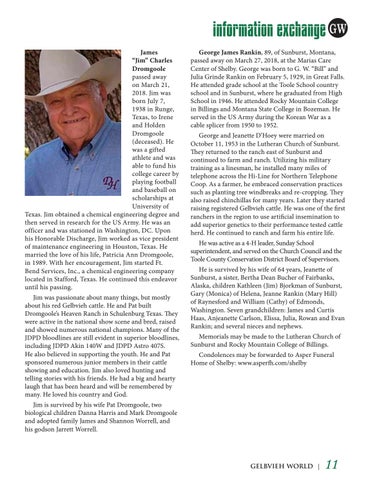 information exchange GW James “Jim” Charles Dromgoole passed away on March 21, 2018. Jim was born July 7, 1938 in Runge, Texas, to Irene and Holden Dromgoole (deceased). He was a gifted athlete and was able to fund his college career by playing football and baseball on scholarships at University of Texas. Jim obtained a chemical engineering degree and then served in research for the US Army. He was an officer and was stationed in Washington, DC. Upon his Honorable Discharge, Jim worked as vice president of maintenance engineering in Houston, Texas. He married the love of his life, Patricia Ann Dromgoole, in 1989. With her encouragement, Jim started Ft. Bend Services, Inc., a chemical engineering company located in Stafford, Texas. He continued this endeavor until his passing. Jim was passionate about many things, but mostly about his red Gelbvieh cattle. He and Pat built Dromgoole’s Heaven Ranch in Schulenburg Texas. They were active in the national show scene and bred, raised and showed numerous national champions. Many of the JDPD bloodlines are still evident in superior bloodlines, including JDPD Akin 140W and JDPD Astro 407S. He also believed in supporting the youth. He and Pat sponsored numerous junior members in their cattle showing and education. Jim also loved hunting and telling stories with his friends. He had a big and hearty laugh that has been heard and will be remembered by many. He loved his country and God.