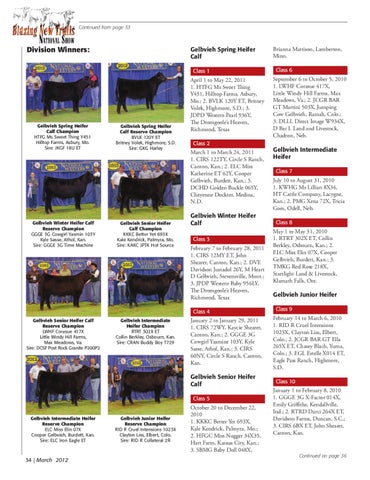 February 7 to February 28, 2011 1. CIRS 12MY ET, John Shearer, Canton, Kan.; 2. DVE Davidson Justadol 26Y, M Heart D Gelbvieh, Stevensville, Mont.; 3. JPDP Western Baby 956LY, The Dromgoole’s Heaven, Richmond, Texas Class 4