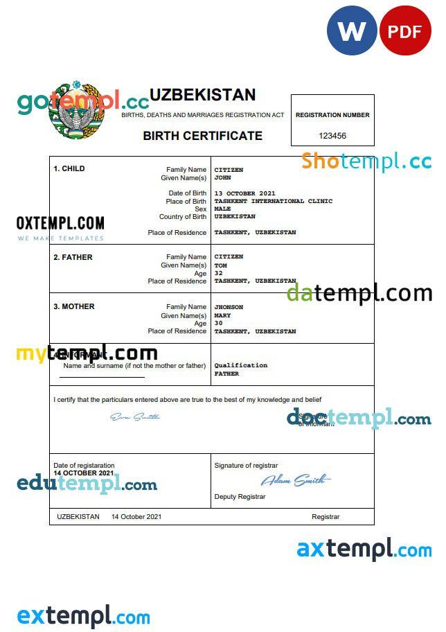 Here you see a fully scalable and editable Uzbekistan birth certificate template at the best price – well organized, named & very easy to use.