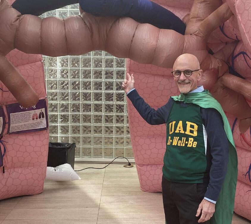 Deacon John Kennedy, MD (aka Dr. Well-Be), is next to giant inflatable lungs during an event at The Kirklin Clinic to promote awareness of common lung diseases and treatments.