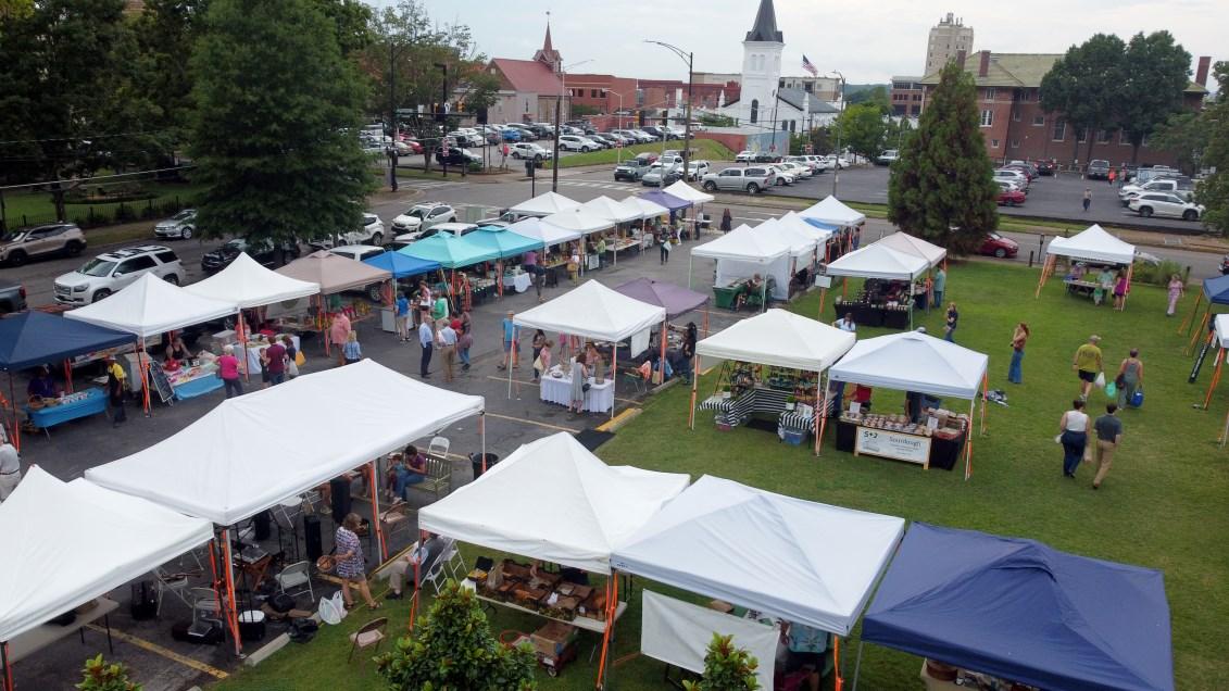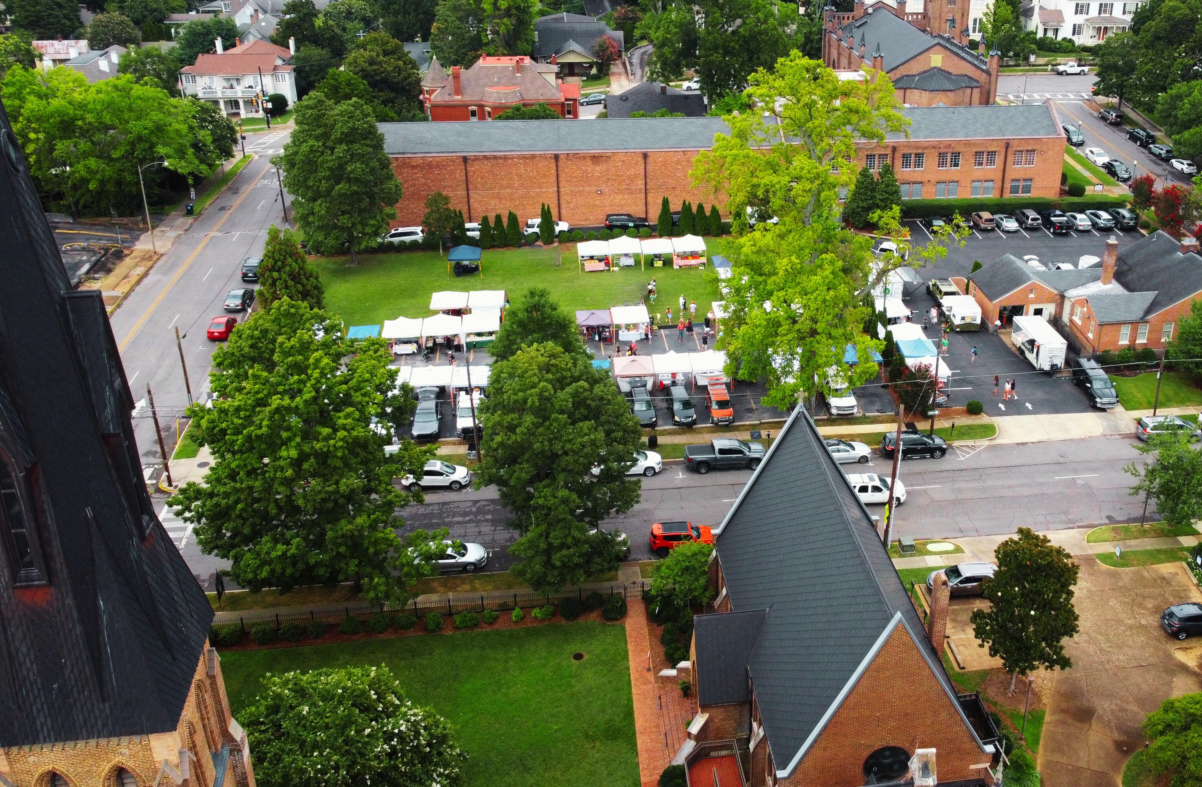 If you happen to be driving in downtown Huntsville on a Thursday morning during the months of May to October, you ’ll spot a group of men and women hauling out folding tables and pop-up tents into the Church of the Nativity parking lot. By 2:00pm, a line of pickup trucks of all makes and models idle on the corner of Greene Street and Eustis Avenue, waiting their turn to back into one of the 55 slots. Church volunteers work behind truck beds full of fruits, vegetables, baked goods, jams, and fresh cut flowers, unloading gifts of the earth. By 3:00pm extension cords