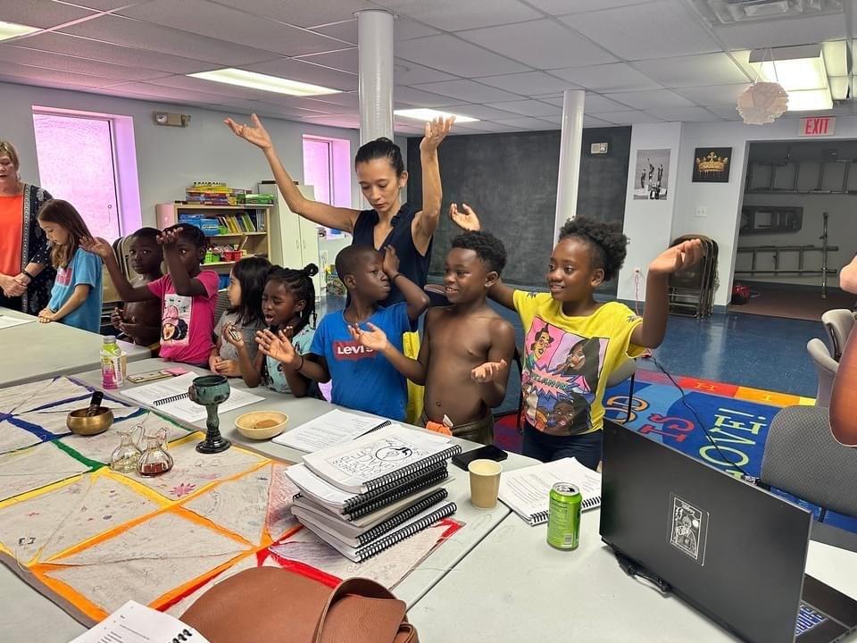 The Rev. Rosa Lindahl, Rector at Holy Comforter; Laura Brendle, left, works alongside the artists and is on the board of Many Colors, and Melanie Hayes, right, serves as Program Lead; The artists enjoying a snack break; Kathy Albree, Lead Artist Mentor of the program