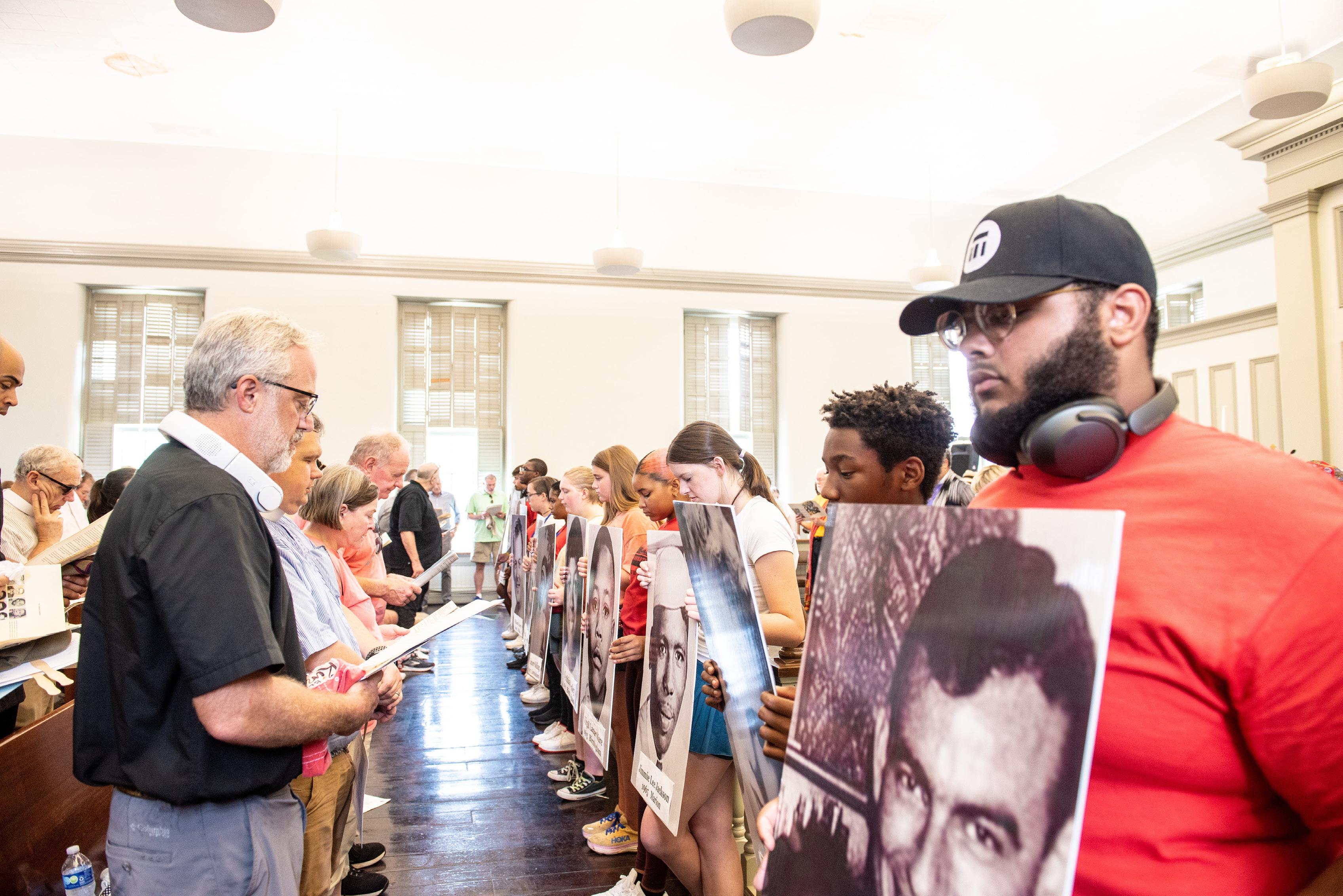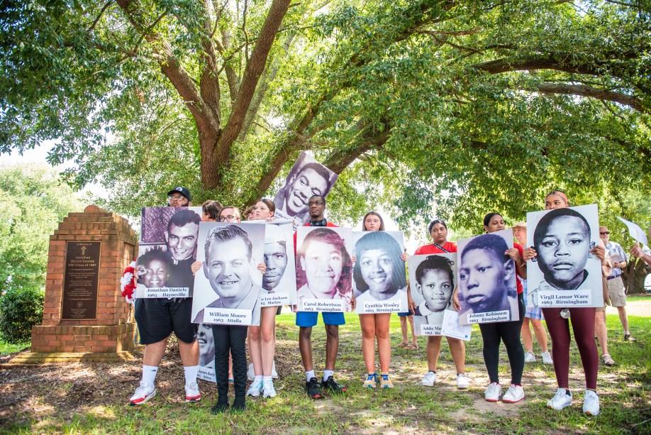 At right: Youth from the Diocese of Alabama and from New York holding photographs of the Alabama martyrs. The Rev.