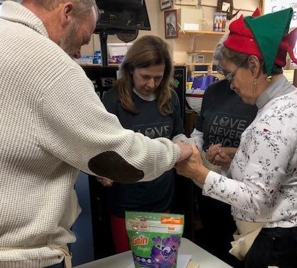 Deacon Charlotte Van Dyke, praying with our Laundry Love volunteers in a neighborhood laundromat.