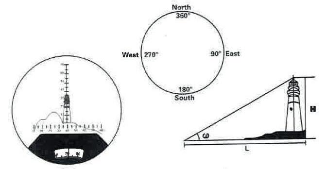 Der Seitenwinkel kann durch den in der rechten Körperhälfte eingebauten Kompass gemessen werden. Sie zeigt den Seitenwinkel des Objekts relativ zum Beobachter an. Jede Graduierung des Kompasses entspricht einem Grad. Wenn das Objekt im Norden liegt, zeigt der Kompass 360° (Grad) an. Und sie wird sich erhöhen, wenn Sie im Uhrzeigersinn drehen. 90° bedeutet, dass sich das Objekt in Richtung Westen befindet, 180° bedeutet Süden und 270° bedeutet Westen. Um präzise Winkelmessungen zu gewährleisten, sollte das Fernglas beim Ablesen des Kompasses horizontal und waagerecht gehalten werden. Das Objekt sollte sich in der Mitte des Fadenkreuzes befinden. Bei Nacht oder Dunkelheit müssen die Ziffern des Kompasses und des Fadenkreuzes durch Drücken der Ein-/Aus-Taste beleuchtet werden.