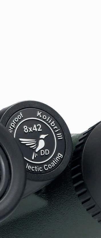 Properties Kolibri 10x33 Kolibri 8x42 Kolibri 10x42 Weight in g 443 615 595 Magnification 10 x 8 x 10 x Lens Ø in mm 33 42 42 Pupillary distance in mm 54-71 55-75 56-76 Exit pupil in mm 3.3 5.25 4.2 Field of view at 1000 m in m 106 126 106 Viewing angle in degrees (°) 6.1 7.2 7.2 Eyecups TwistUp metal TwistUp metal TwistUp metal Prism type Schmidt-Pechan Schmidt-Pechan Schmidt-Pechan Prism mirroring Phase Coating Phase Coating Phase Coating Lens coating FMC HDX FMC HDX FMC HDX Raindefender RNP coated RNP coated RNP coated