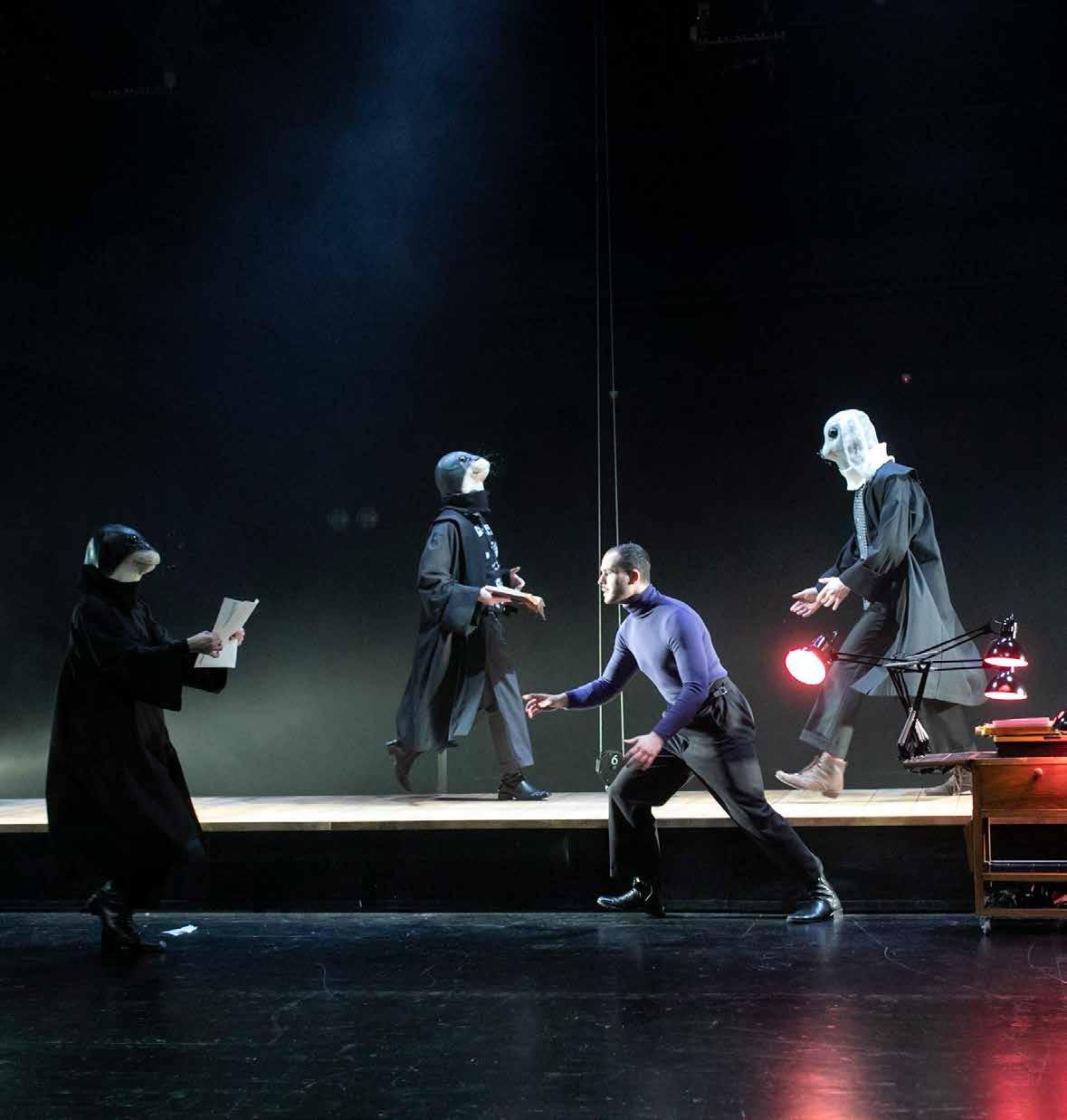 Neu im Spielplan! Unser Einstieg in die Welt von Franz Kafka: sinnlich, komisch und nur ein bisschen düster. Als große Inszenierung mit sieben Darsteller*innen auf der Bühne, die schon Fünftklässler*innen neugierig auf den großen geheimnisvollen Schriftsteller macht: Eines Morgens wird Herr K., »ohne dass er etwas Böses getan hätte«, verhaftet. Warum, erfährt er nicht. Auf der Suche nach Antworten trifft er allerhand kafkaeske Figuren, darunter ein Informationsbeauftragter, der K.’s Personalien eifrig in eine Schreibmaschine tippt. Liegt hier ein Irrtum vor oder hat Herr K. möglicherweise doch Schuld auf sich geladen?