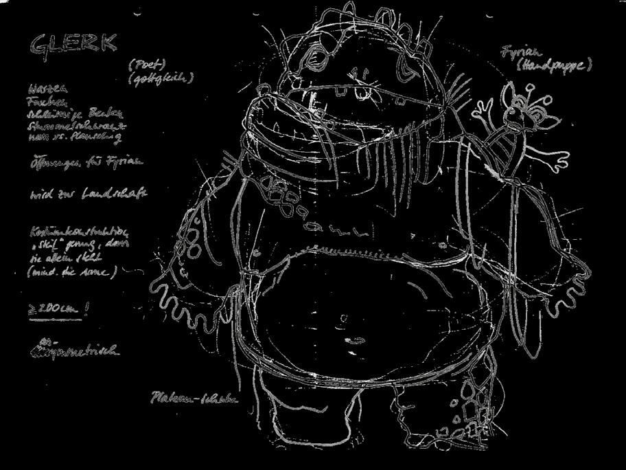 Kostüm-Entwürfe für Luna, das Sumpfmonster Glerk und den Drachen Fyrian von der Kostümbildnerin Julia Pommer