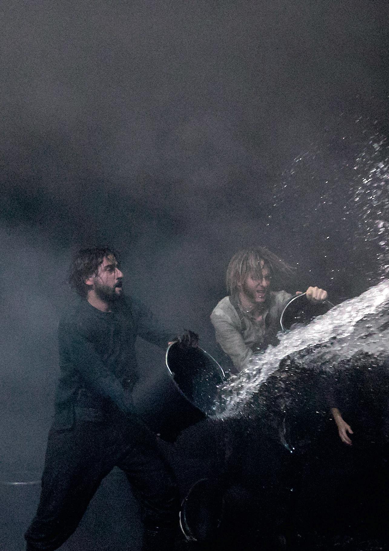 Darf man in einem Theater eigentlich mehrere Eimer – randvollgefüllt mit Wasser – auf die Bühne schütten? Die Antwort lautet: »Ja!« Zumindest, wenn die technischen Bedingungen es zulassen. Dank Lastwagenplane und einem Technikteam, das mit allen Wassern gewaschen ist, zeigt das Junge Schauspiel eine stürmische Wasserschlacht und die Geschichte der Jagd nach Moby Dick – dem gigantischen weißen Wal, über den sich die Crew an Board die schauerlichsten Geschichten erzählt. Doch manchmal trügt der Schein und die Frage, wer eigentlich das größere Ungeheuer ist – Mensch oder Wal – drängt sich auf, wenn Kapitän Ahab nicht nur sein eigenes, sondern auch das Überleben seiner Crew aufs Spiel setzt, bloß um Rache zu nehmen. Für alle Wasser- wie Landratten ab 12!
