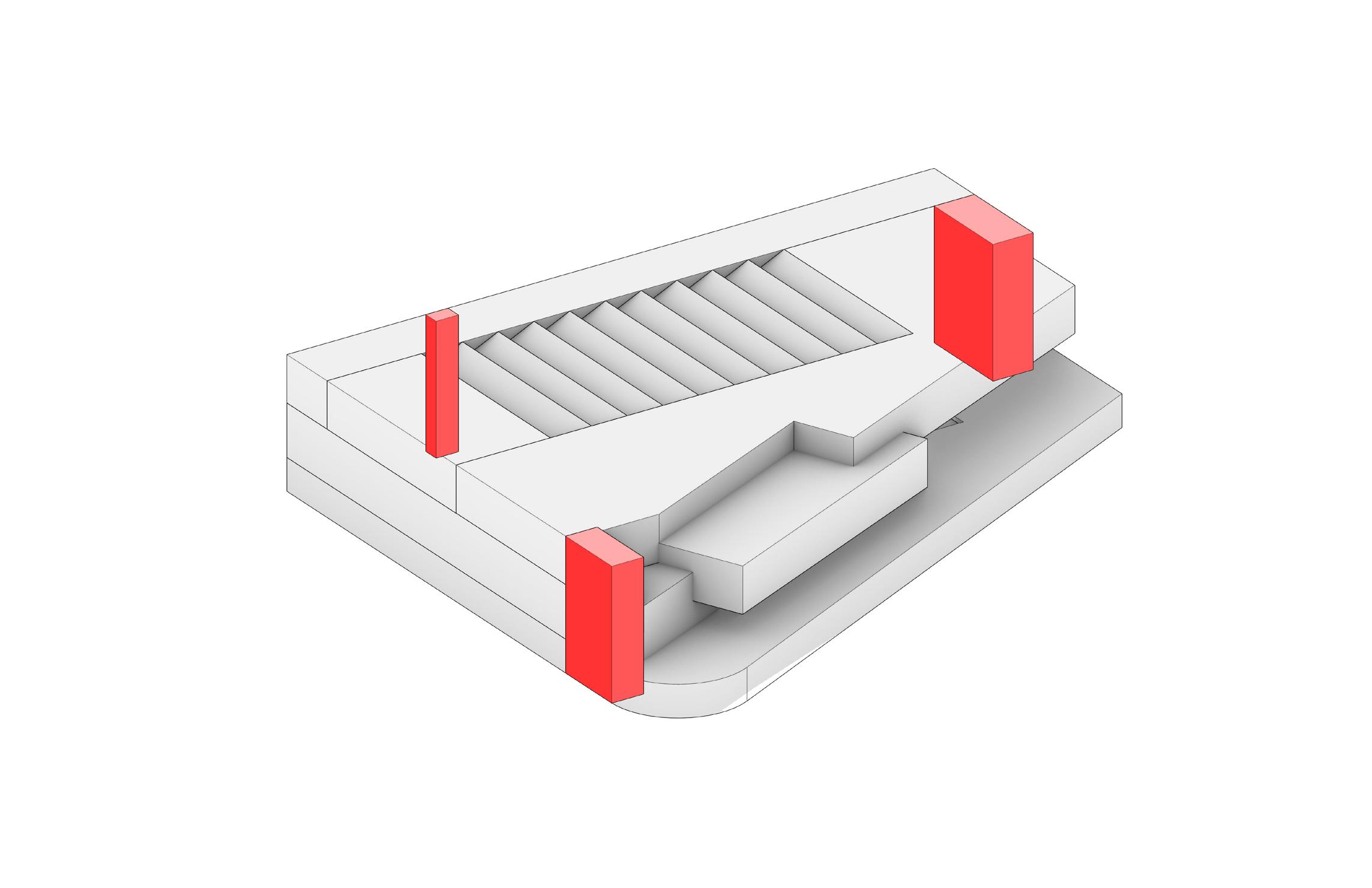 By utalizing the sites elevated topography, the building’s parking structure is sunken into ground for easy parking access. The building is then slighlty elevated using the pool’s structural walls as support. These elements create a spaceous experience that make for a visually light weight design.