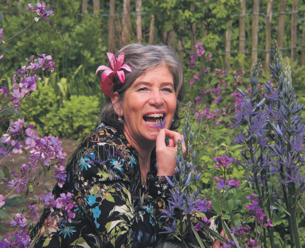 Anna Koster in haar tuin vol eetbare bloemen