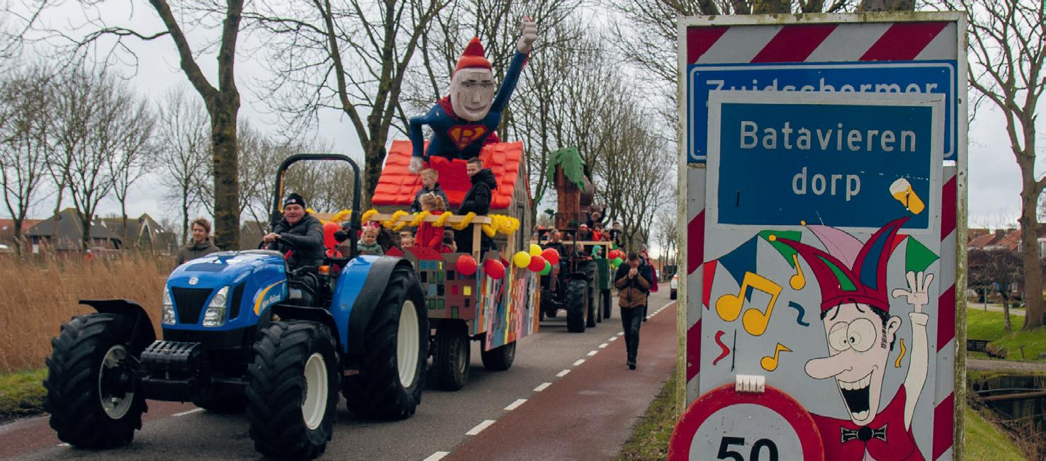 De Batavieren pakte op zondagmiddag uit met mooi versierde praalwagens, voortgetrokken door trekkers. De middag begon spannend voor de kinderen. De sleutel van het carnaval was verstopt in de jukebox, die nog kon praten ook. Suzan De Reus werd erbij gehaald en met liedjes van K3 kwam de sleutel tevoorschijn. Ook was het spannend of voor alle toegestroomde kinderen wel een plekje was in een van de vijf prachtige praalwagens. Iedereen kon mee, de allerkleinsten onder begeleiding van ouders. Zo begon de tocht langs de Zuidervaart, waar de vlaggen uithingen en de voorbijgaande stoet werd toegejuicht.