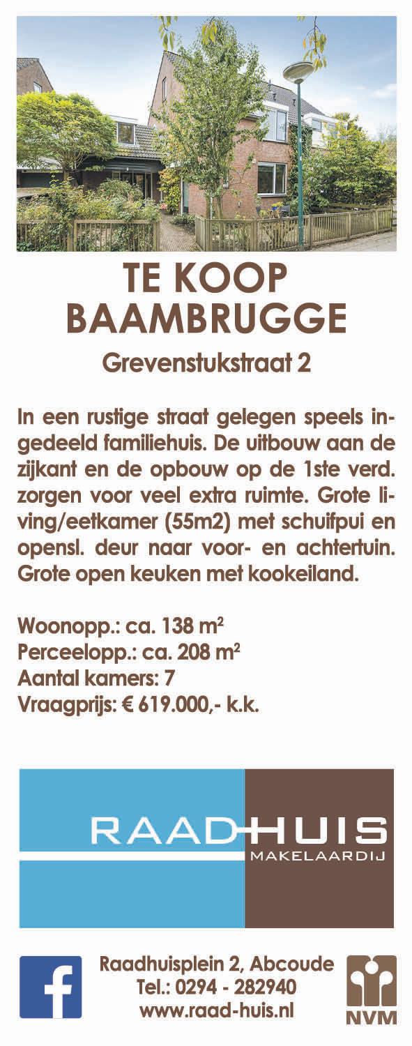 Van Ekris Mijdrecht www.vanekris.nl Zoeken wij jou? Toyota Verkoper gezocht fulltime Vanekris.nl Energielabel B vidamakelaars.nl Smaragd 6 in Mijdrecht € 795.000,- k.k. 0297 - 283 375 • www.ruijgrok.nl Iedere vrijdag van 11:00 tot 12:00 uur Koffietijd bij Ruijgrok Makelaars, voor al uw woonvragen. Dorpsstraat 7, Wilnis T: 0297-25 03 01 Wij zijn uw Bank. zelfstandigadviseur Regio Bank PROVINCIALE STATEN OVER DE BEGROTING VAN 2023 COMFORT DEAL WEKEN UITGESLAPEN WAKKER WORDEN VOOR EEN DROOMPRIJS UTRECHT IEDERE ZONDAG GEOPEND Hilversum Vaartweg 4 • 035 - 6247194 Utrecht Oudkerkhof 11 • 030 - 2314984 Bilthoven Julianalaan 43 • 030 - 2287451 MORPHEUS.NL Voorlichtingsavond over borstvoeding www.borst-voeding.nl 16 november 2022 Voor zwangere en haar partner 20 euro per stelWoensdagavond van 19:30 tot 21:30 uur Moeder & Kind Centrum De Ronde Venen Bozenhoven 19D Mijdrecht Aline Bakker Lactatiekundige IBCLC aline@borst-voeding.nl 06-12325807 Fluitekruid 27, Mijdrecht Vraagprijs € 679.500,- k.k 0297-524124 www.kooplenstra.nl Woensdag 9 november 15.00 – 17.30 uur OPEN HUIS WEKELIJKS HUIS-AAN-HUIS IN: MIJDRECHT • WILNIS • VINKEVEEN • DE HOEF • WAVERVEEN •AMSTELHOEK • ABCOUDE • BAAMBRUGGE JAARGANG 25 - WEEK 44 – 4 NOVEMBER 2022 DE