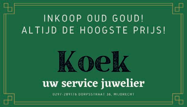 Toyota Van Ekris www.vanekris.nl Maak een afspraak online of bel 0297-230350! APK alle merken NIEUW vidamakelaars.nl Bozenhoven 188 in Mijdrecht Vraagprijs € 400.000,- k.k. Dorpsstraat 7, Wilnis T: 0297-25 03 01 Wij zijn uw Bank. zelfstandigadviseur Regio Bank Nu iedere zondag open! (16:00-20:00) SCHUIF JE OOK AAN BIJ FAMILY MIJDRECHT? Dorpsstraat 17 | 3641 EA Mijdrecht t.: 0297284964 kom lekker langs of Laat je eten bezorgen www.familymijdrecht.nl winstuitjewoning.nl/de-ronde-venen Huurders, vergeet je waardebon niet! Wissel deze in voor energiebesparende producten winstuitjewoning.nl/de-ronde-venen Huurders, vergeet je waardebon niet! Wissel deze in voor energiebesparende producten GOUDINKOOP BIJ U THUIS BEL ONS VOOR EEN AFSPRAAK EN ONTVANG DE HOOGSTE PRIJS VOOR UW GOUD EN ZILVER, BETALING CONTANT OF VIA BANK Openingstijden Dinsdag t/m zaterdag 09.30 - 17.30 uur Herenweg 169a 3645DK Vinkeveen 0297 743 565 E W info@ormontre.nl www.ormontre.nl ormontre WEKELIJKS HUIS-AAN-HUIS IN: MIJDRECHT • WILNIS • VINKEVEEN • DE HOEF • WAVERVEEN •AMSTELHOEK • ABCOUDE • BAAMBRUGGE JAARGANG 25 - WEEK 40 – 7 OKTOBER 2022 Hebjeinteresse? Neem dan contact op met ons via info@degroenevenen.nl of bel 0297-38 52 57.