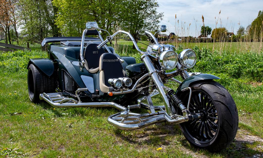 Want dat is deze Boom Mustang: megavet, vol met extra’s en in een werkelijk prachtige kleur groen. Ik riep meteen “British Racing Green”, maar Jeroen, de duizendpoot van het Trike Centrum, verbetert me: het is Ferrari Racing Green. In ieder geval machtig mooi, zo is ook het geluid dat uit de vier collectoren komt. Als je je incognito wilt verplaatsen, dan is deze machine niets voor jou, want het is een echte show-stopper en ongemerkt voorbij rijden is er niet bij met deze Boom. Met het prachtige weer is het een ideaal vervoermiddel. Heupgordel om en rijden maar, een helm is daardoor niet verplicht en je kunt de Trike met een autorijbewijs berijden. Ik ga richting De Hoef om daar wat foto’s te maken en relaxed langs het water een ritje te maken. De 5 versnellingsbak van de Ford 1600 cc motor schakelt als het spreekwoordelijke mes door de warme roomboter. Je voelt je als een vorst op de weg, Deze St1 is een extra lange versie en daar moet je wel even mee oppassen in de bochten door zijn breedte, want ook de achterwielen van Compressor Design zijn maar liefst 295 mm breed.