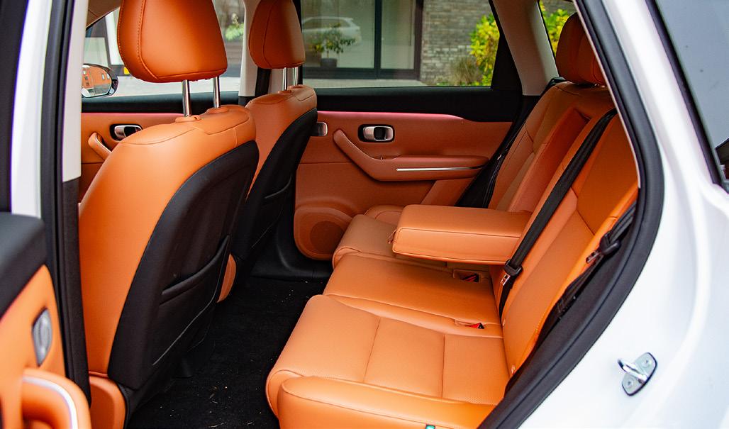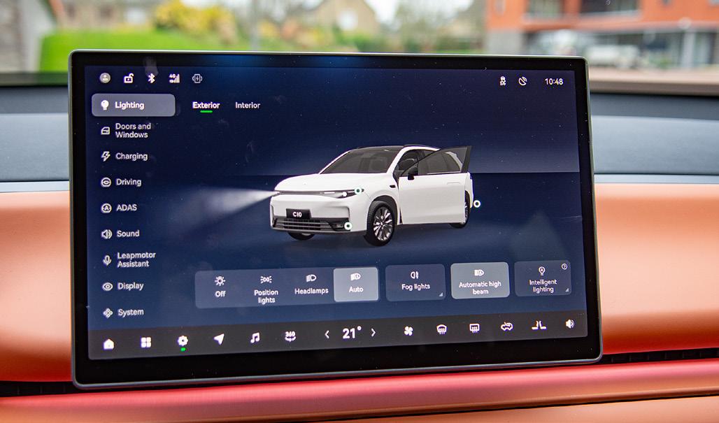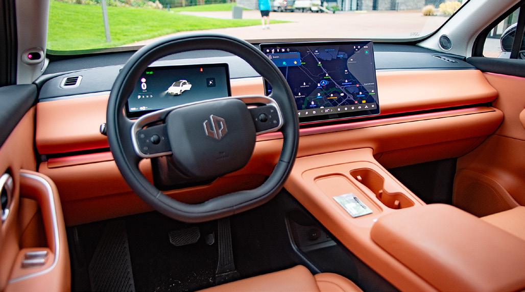Geen sleutel, maar een betaalpasformaat die ik op zak moet hebben om de verzonken hendels te openen, om vervolgens de kaart in het dashboard te leggen om alles aan de praat te krijgen. Zodra ik me in het leder nestel, schuift de Leap gedienstig mijn stoel aan. Wat een luxe! Zodra ik de stoel gefinetuned heb, zit hij automatisch in het geheugen; het prachtige lichtbruine kunstleer heeft dezelfde kleur als al het kunststof in de auto. Even wennen, maar best heel mooi.