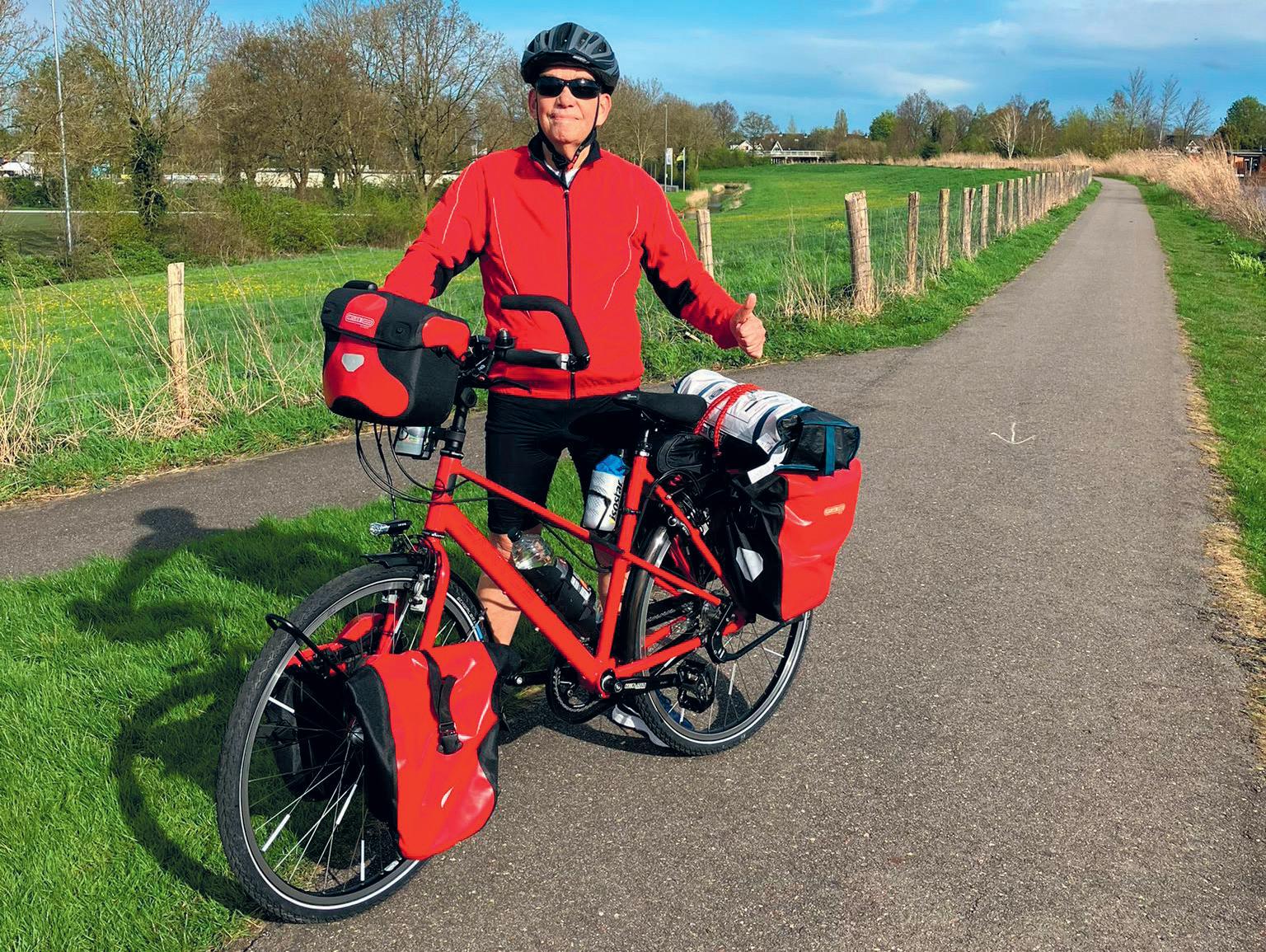 dat misschien naar 5 met 2 rustdagen. Er zullen ook dagen zijn dat ik rond het middaguur mijn daggemiddelde van 60 al heb gehaald en denk: ‘ik doe er nog 20 bij’.” Zijn knalrode Santos trekkingbike met 14 versnellingen (geen derailleur) en de lichtste overbrenging is bij uitstek geschikt voor deze routes.