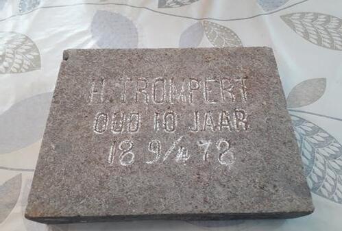 De zoektocht begon eind vorig jaar toen de steen tijdens het opruimen van de vliering van Agnes Rademaker weer boven water kwam. De gedenksteen – met de inscriptie: H. Trompert, 10 jaar oud.