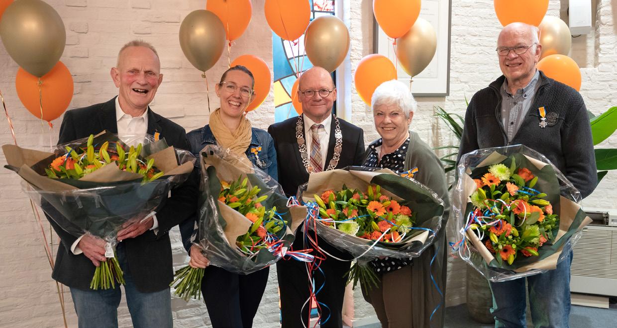 Vijf inwoners van De Ronde Venen zijn deze woensdag verrast met een koninklijke onderscheiding. Vier van hen ontvingen de onderscheiding uit handen van burgemeester Maarten Divendal tijdens een feestelijke bijeenkomst in het gemeentehuis. Frans van der Pouw Kraan (links) werd benoemd tot Lid in de Orde van Oranje-Nassau, Mirelle Valentijn-Tersteeg (tweede van links) is benoemd tot Ridder in de Orde van Oranje-Nassau. Petra Brugmans-Ros (tweede van rechts) is onderscheiden als Ridder in de Orde van Oranje-Nassau en Piet van Dijk (geheel rechts) werd benoemd tot Lid in de Orde van Oranje-Nassau.