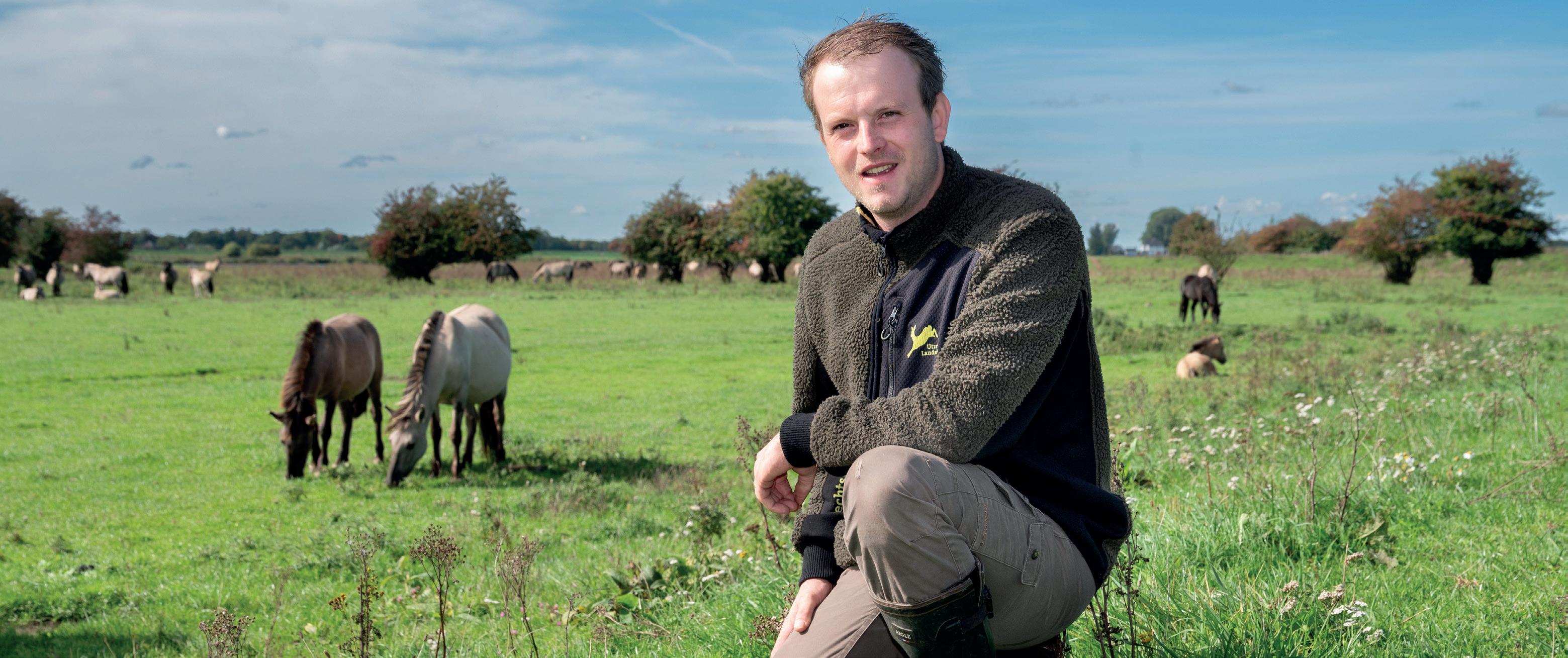 Kuddebeheerder Juleo Litjens in de Elster Buitenwaarden, met op de achtergrond konikpaarden