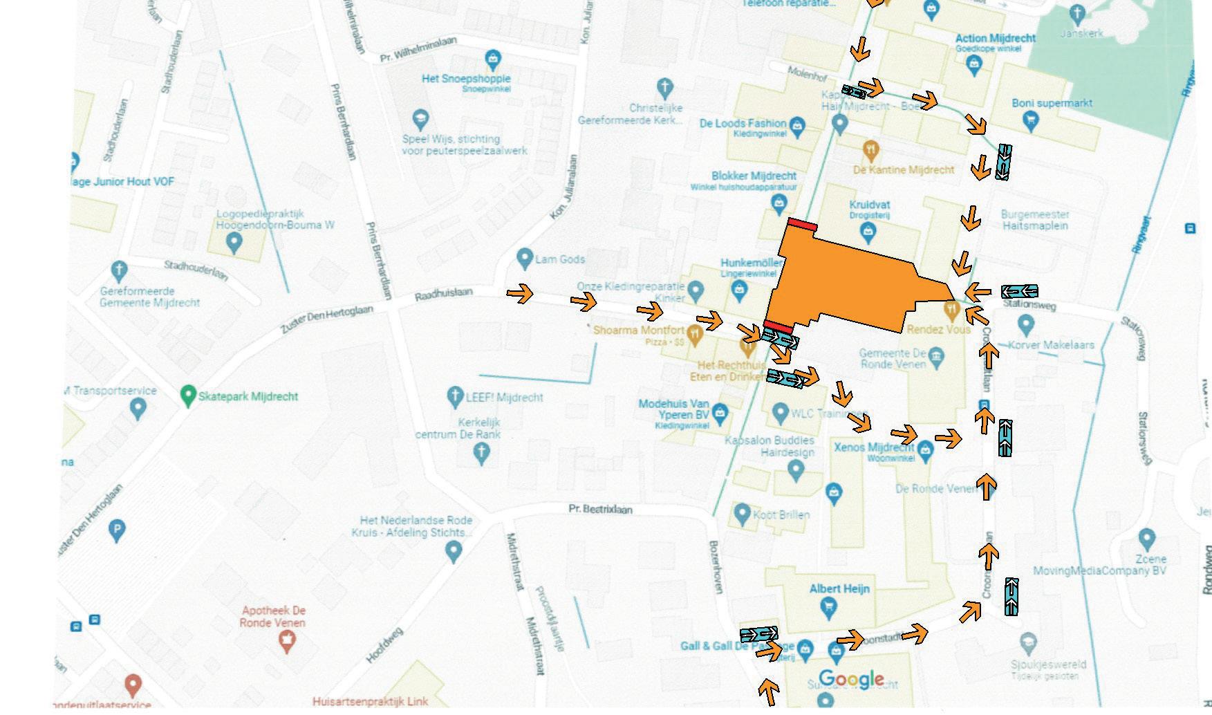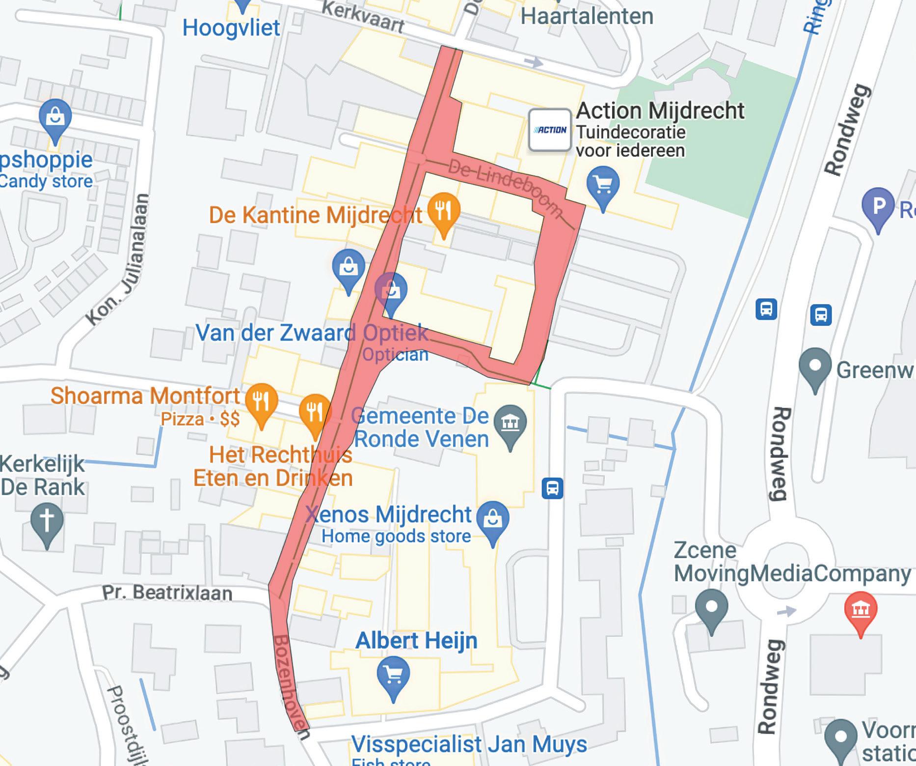 Kindervrijmarkt gebied (zie kaartje) Verkoopwaar mag worden uitgestald in het centrum van Mijdrecht in het roodomrande gebied op de plattegrond (Dorpsstraat tot de Kerkvaart, plein bij de Lindeboom, fietspad Burg-