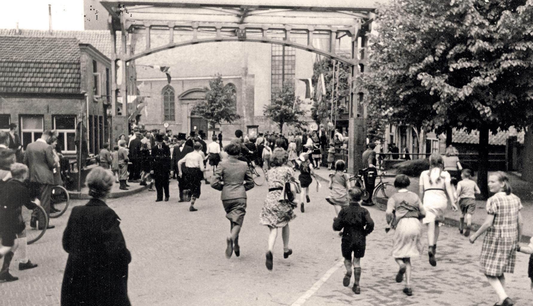 Uitgelaten inwoners spoeden zich richting het Kerkplein in Abcoude waar de Binnenlandse Strijdkrachten zich opmaken om collaborateurs op te pakken. Foto: Collectie Ton Pepping.