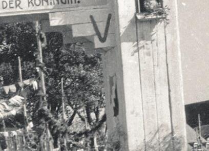 Zie je links op de tekening de poort ‘Oranje en vrijheid’? In deze krant vind je de foto waarop dit deel van de tekening is gebaseerd. De foto is gemaakt bij het bevrijdingsfeest in Wilnis. Kun jij de foto in deze krant vinden?