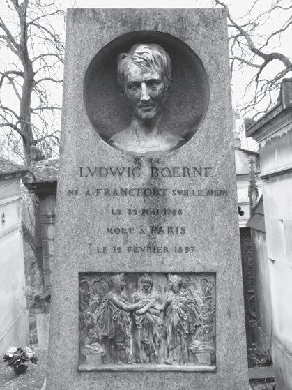 Ein letztes Porträt von der Hand Davids soll zum Schluss hier Erwähnung finden. 1842 fertigte er im Auftrag eines Komitees, das eigens gebildet worden war, die Büste von Ludwig Börne für dessen Grabmal auf dem Friedhof Père Lachaise an (Abb. 10). Darunter ist ein ebenfalls von David entworfenes Bronzerelief angebracht, auf dem drei Frauen zu sehen sind: Links und rechts die Personifizierungen von Frankreich und Deutschland, die eine mit einem Lorbeer-, die andere mit einem Eichenkranz gekrönt, die ihre Wa en hinter sich niedergelegt haben und sich die Hände reichen. Ermutigt werden sie von der Frau in der Mitte, der Verkörperung der Liberté mit der phrygischen Mütze. Zu beiden Seiten der Figurengruppe ragen zwei Sockel heraus, die auf ihrer Vorderseite die Namen von Voltaire, Rousseau, Lamennais, Béranger sowie von Lessing, Herder, Schiller und Jean Paul tragen. Wie Börne, der wegen seiner politischen Gesinnung in Paris im Exil gelebt hatte, wo er 1837 gestorben war, haben diese Schriftsteller in besonderer Weise zum politischen Fortschritt und zur Annäherung der beiden Kulturen Frankreichs und Deutschlands beigetragen. Das Grabmal ist damit auch ein Plädoyer für die deutsch-französische Freundschaft und eine frühe Würdigung des deutsch-französischen Dialogs.¹¹5