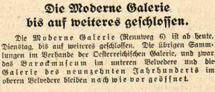 Eröffnung der Modernen Galerie als staatliches Museum mit der Gründungsintention der Präsentation österreichischer Kunst im internationalen Kontext. Provisorische Einrichtung im Unteren Belvedere.
