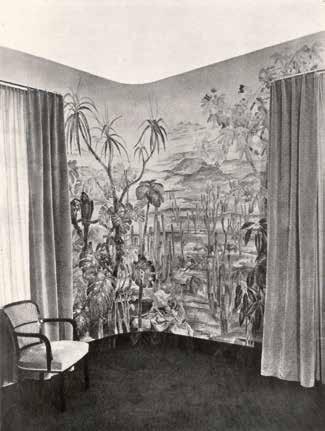 hellgelbe Vorhänge,29 deren Muster an das Peche-Dessin Kardinal erinnern. Damit erwies sie ihre Referenz gegenüber dem früh verstorbenen Künstlerkollegen und bereitete zugleich eine Bühne – Vorhang auf! – für die aktuellen Produkte des österreichischen Designs. In derselben Ausstellung war ein Speisezimmer von Wilhelm Jonasch zu sehen, „das Hilde Jesser durch graziöse Wandbemalung in einen entzückenden Gartensalon verwandelt hatte“.30 Spaliere mit Rankpflanzen, Vögeln und Schmetterlingen gaben den Blick in eine asiatisch anmutende Landschaft frei. Der Raum stellte damit ein Beispiel für die in den 1920er-Jahren so beliebten Chinoiserie-Motive im Interieur dar; zugleich erinnern die Spaliere an die BerglZimmer in Schloss Schönbrunn.