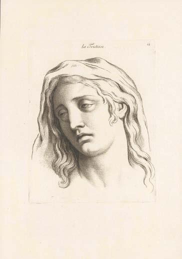 Cromek damit beauftragt, das Gedicht des schottischen Dichters zu illustrieren.2 Er fertigte insgesamt vierzig Zeichnungen an, doch seine Probegravuren fanden bei Cromek keine Anerkennung, sodass Blakes Rivale Luigi Schiavonetti 1808 den lukrativen Auftrag erhielt, zwanzig der vierzig Entwürfe zu stechen. Trotz der Tatsache, dass Blakes Entwürfe von Cromek letztlich abgelehnt wurden, zeigt sich in seiner Zeichnung The Widow Embracing her Husband’s Grave, wie intensiv er sich bereits im Rahmen des ursprünglichen Projekts mit dem Thema des Verlusts und der Trauer auseinandersetzte. Dabei greift er auf verschiedene künstlerische Vorlagen zurück: Während sowohl die Mimik als auch das gelöste Haar der Verzweifelten dem verbindlichen und von Charles Lebrun entworfenen Typus der Tristesse entsprechen (Abb. 2), reiht sich das Bildthema in die Tradition der Darstellung trauernder Witwen ein. So lässt sich Blakes Zeichnung beispielsweise mit zeitgenössischen Darstellungen der Andromache in Verbindung bringen, die den Tod Hektors beweint und sich dabei oftmals, etwa in Gavin Hamiltons Ölskizze von 1760