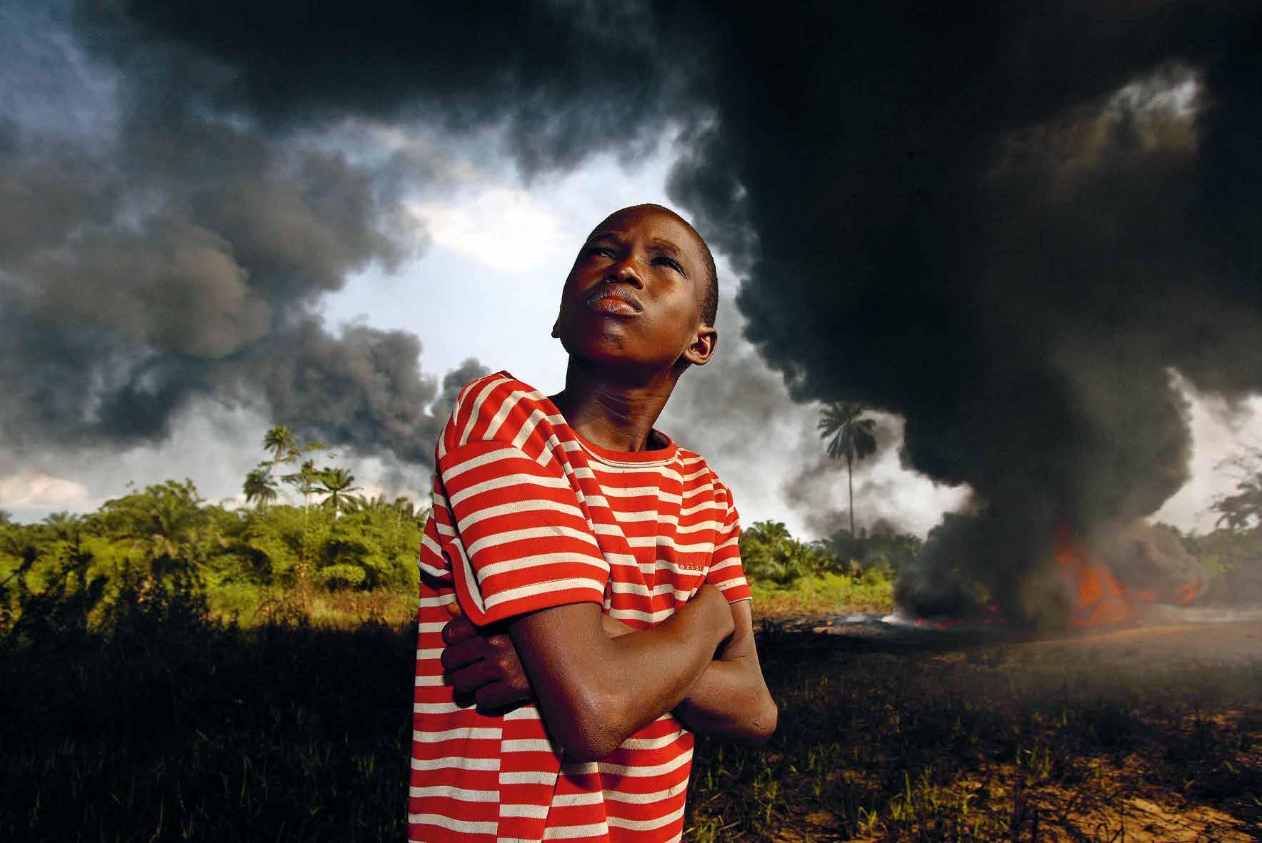 The Niger Delta. An art piece of nature that, with its anastomosing riverbeds embedded into a bright green landscape prograding into the blue of the Atlantic Ocean, has an almost surreal beauty. On the other hand, as portrayed by photographer George Osodi under life-threatening conditions, an ecological catastrophe so gigantic and overwhelming that even the incorruptible camera lens seems hardly able to convey a dirty truth that words would not do justice. Millions of liters of oil spilled virtually everywhere. Almost as if an expanding black hole would suck the color out of each and every tree branch, stream, pebble, and grass root to feed its never-ending appetite. It’s not that the oil’s deep black coloration and silky shine wouldn’t also inherit a certain beauty in themselves. But disconnecting its visual elegance—for lack of a better description of its intense visual presence—from the drastic consequences of its harmful appearance, is unthinkable. Adding animals to the picture—even humans, toddlers, elderly women baking traditional bread and cake over gas flares set up a long time ago by global players in the oil industry, young, apparently strong and healthy men working in rudimentary refineries and following the promise of long-desired wealth and social status—makes for the plot of a disaster movie way beyond Hollywoodesque exaggeration. And yet the pictures show nothing but the plain reality of a society addicted to turbo consumption. A reality in which we all play our part. A reality that seldomly becomes as graphically visible as in the Niger Delta, yet existing in similar ways all over the globe— besides the realms of those wealthy enough not to be held responsible for their