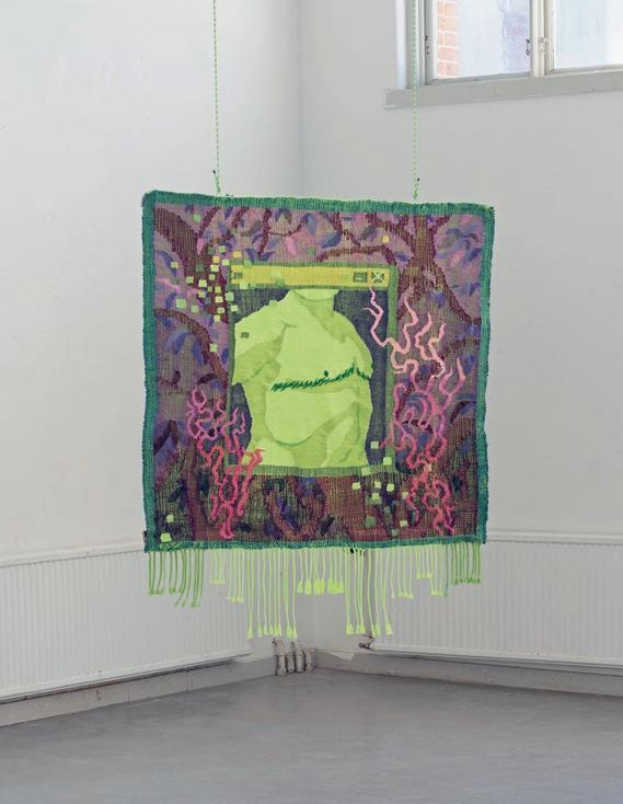 The connections between weaving , webbing, coding , and the internet have been unfolded by techno-feminist thinkers such as Sadie Plant. 15 Joanna Zylinska draws on Plant and Haraway in her essay “Webwords: From the Spider’s Web to Cyberspace” to explore the cyborg as the uncanny product of “the network of contemporary technologies and communication devices [where] images from the allegedly separate domains of nature and culture are positioned side by side.”16 Swedish textile artist Esse McChesney uses weaving, sewing, and stitching in their work on queer and nonbinary bodies. The embroidery Mastectomy (2020) shows a blue torso almost resembling an antique sculpture without arms, head, or lower body, but with yellow stitches under the flat breasts and small stitches around the nipples, mimicking interventions in gender affirmation surgery. The torso itself is also composed of stitches, challenging ideas about the original or natural body. Similarly, at the center of the large weaving Longing/Worry (2022) is a greenish, almost glowing torso with lines of dark green stitches after chest surgery (Figure 2). Here the torso is cut off by the frames of what appears to be a digital, screen-based image in the same visual language as the selfies taken and shared on social media that are particularly important among trans and queer community groups.17 The reference to online sources is emphasized by small squares, looking like pixels (or glitches) in various shades of green that spread out on the background pattern. This pattern consists of trees, leaves, branches, and more abstract growths looking like
