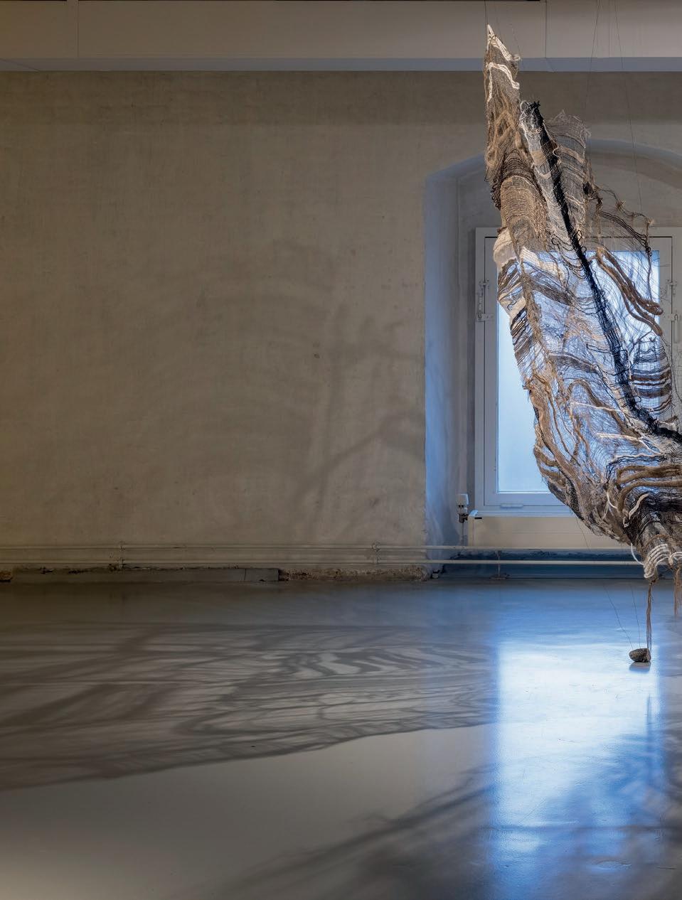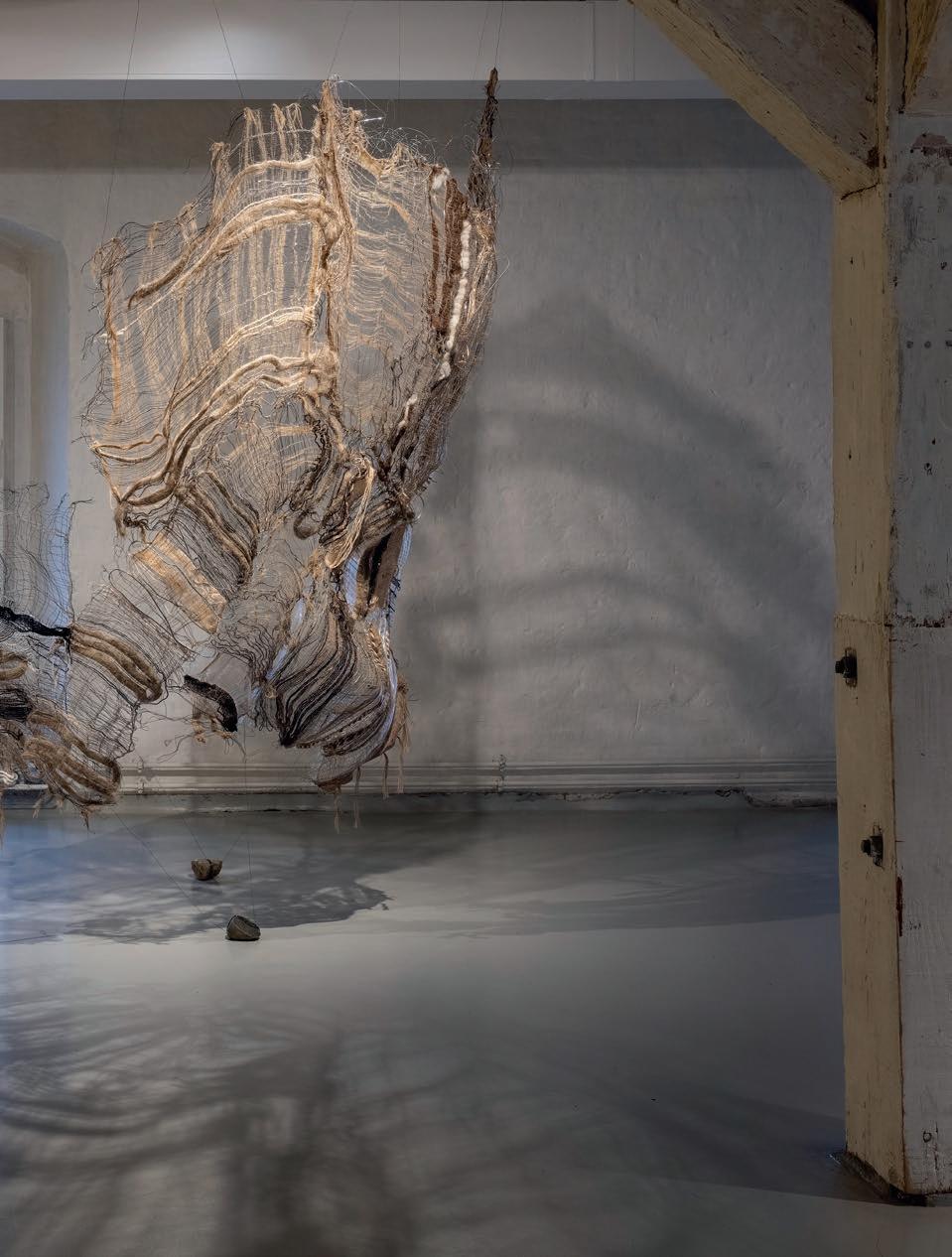 Alda Mohr Eyðunardóttir, To Change What Was Intended, 2020, wool, nylon, linen, silk, steel wires and rocks, 2 × 2 m. The National Gallery of the Faroe Islands.