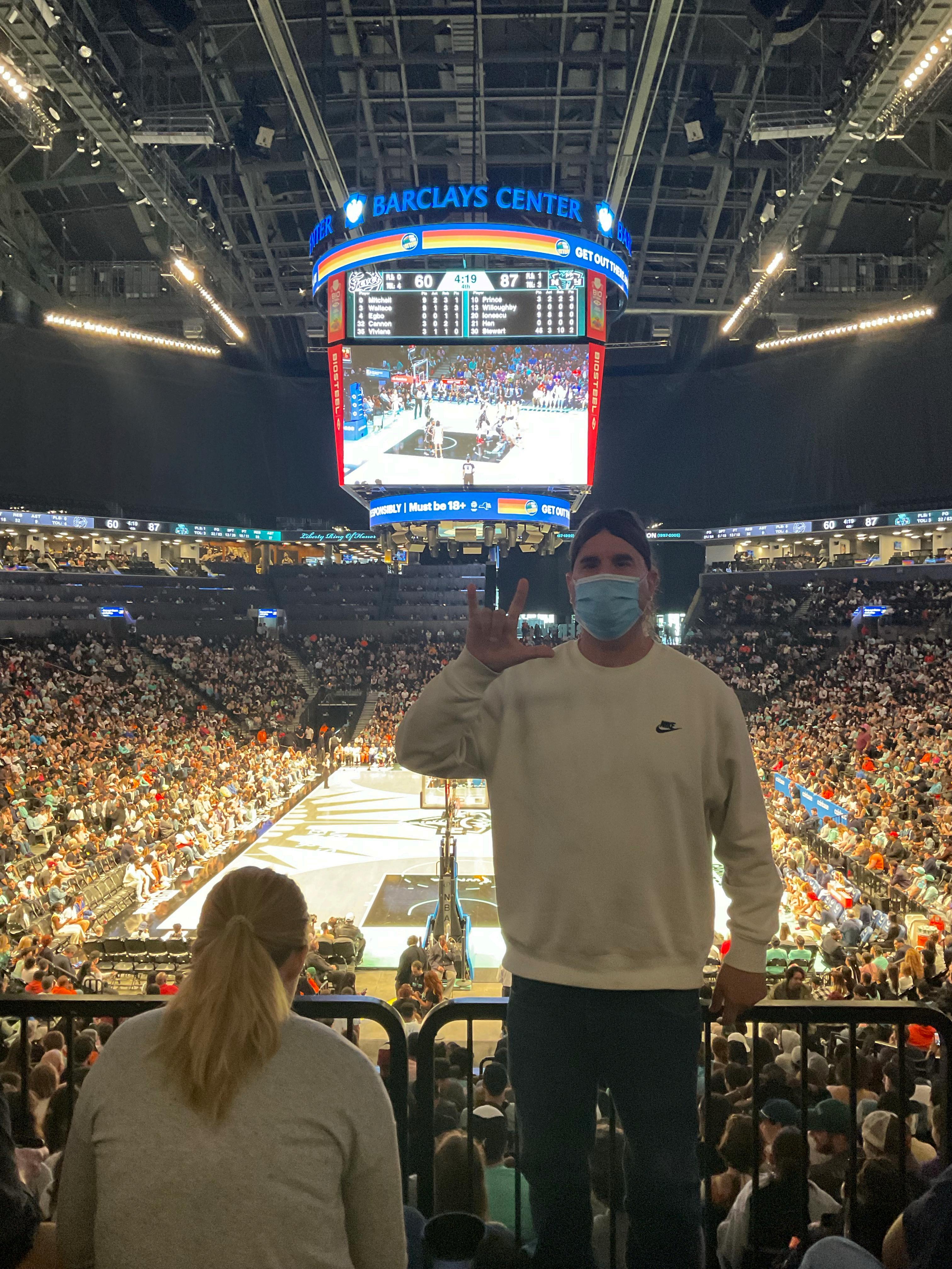 Gary Noll Deaf from New Jersey, witnessed NY Liberty WNBA professional women basketball got their home opener win at Barclay Center, Brooklyn NY on May 21, 2023. Still advocate live captions on scoreboards as well as mobile captioning QR code advertisement at Barclay Center.
