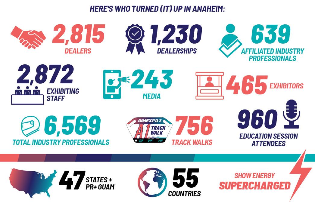 But the bottom line for the 460+ exhibitors was, as always, the dealers. According to the final tally from MIC there were 2,815 dealership personnel representing 1,230 dealerships on hand in Anaheim. Certainly the raw numbers increased from last year’s event in Las Vegas, but more importantly is the quality of the people. As touched on by our owner, editor and publisher emeritus elsewhere in this issue, it is the people who make this industry what it is.
