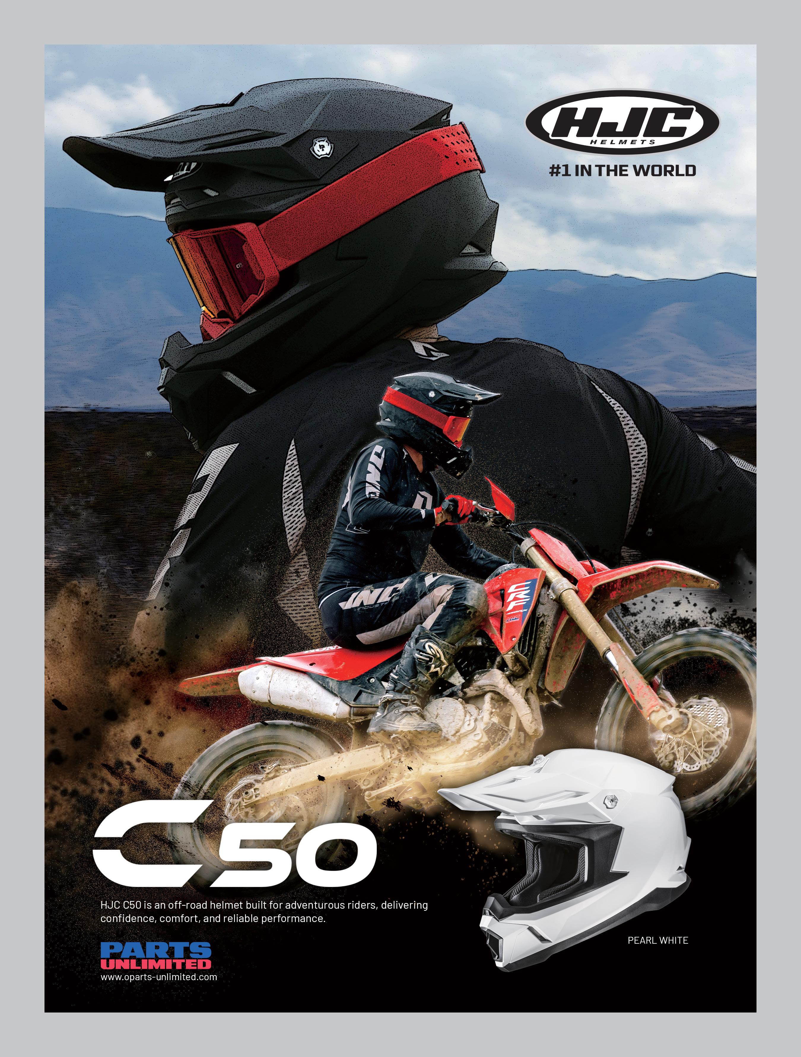 Just in time for the spring thaw, HJC has the new C50 off-road lid. According to the design brief, “this helmet is designed to deliver confidence, comfort and performance for adventurous riders. The removable ventilation cover allows for easy cleaning after muddy or dusty rides, while improved goggle compatibility, expanded eye port and integrated eyeglass grooves provide improved visibility without compromising safety. There are even built-in Bluetooth speaker pockets for added convenience. Bold graphics and colorways to match OEM schemes confirm form follows function. The HJC C50 off-road helmet meets the latest globally recognized safety standard, DOT & ECE 22.06, ensuring reliable protection and functionality not only for everyday off-road riding but also for demanding trails and harsh environments. Equipped with HJC’s Advanced Channeling Ventilation System, the C50 optimizes airflow to maximize ventilation, helping riders maintain a cool and comfortable riding experience even in hot weather or during intense riding conditions. For full specs, head over to the official HJC website: www.hjchelmets.com