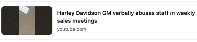 Although the video was quickly pulled from YouTube, dozens of dealers shared it with Dealernews. If you missed it, the video — with altered voices to protect privacy — is still being shared behind the scenes, shows a man identified in the title as a “Harley-Davidson GM” berating a staff member in a sales meeting for not posting photos of a sale on social media, using profanity, threats to “let you go” and statements like “I’ll eat you up and spit you out.”