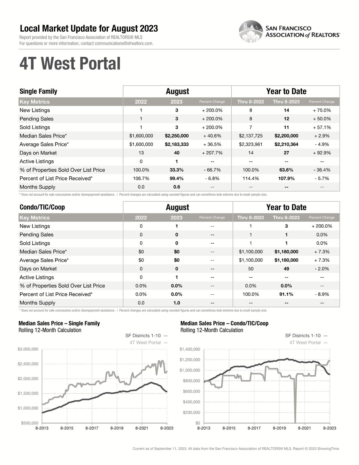 West PortalMarket Update August 2023 Data provided by the San Francisco Association of Realtors All data from the San Francisco MLS Report © 2023 ShowingTime Badessa DRE: 01876759 Dean Badessa 415 474 5140 m Dean@DeanBadessa com