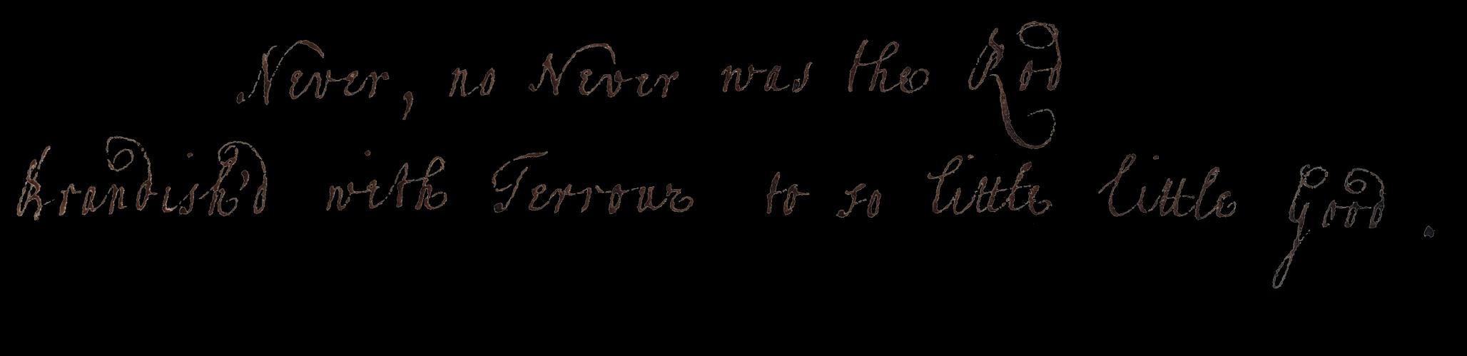 collecting pithy or striking sayings with which to impress his peers (“nothing pleases for she [Phaedra] is so unconstant” (p.47); “let ye stars be driven out of yr courses” (p.55)). Occasionally, he even ‘corrects’ the venerable Roman’s text: on p.84, for instance, he has crossed out the printed text “Quod varda fatum lingua” and replaced it with “qu varda fatu est lingua” – either at the urging of a master or out of his own sense of precocity. Among the pen trials and miscellaneous notes at the rear (which include the vertically written and decidedly Senecan phrase “riches are good but learning better”) is an inscription, reversed, on the final leaf: “H. S. E. Johannes filius Guliel: Berkenhead. d: Henstridge in Cont Somerset: hajus Collegii Chorista qui animam Deo Efflavae 12o Feb: Anno {Salutii 84 Ælatii 18”. This solitary reference to a young man of presumably similar age to Wright was probably copied from a tomb and suggests they were perhaps friends or acquaintances, but we have found no evidence of a connection.