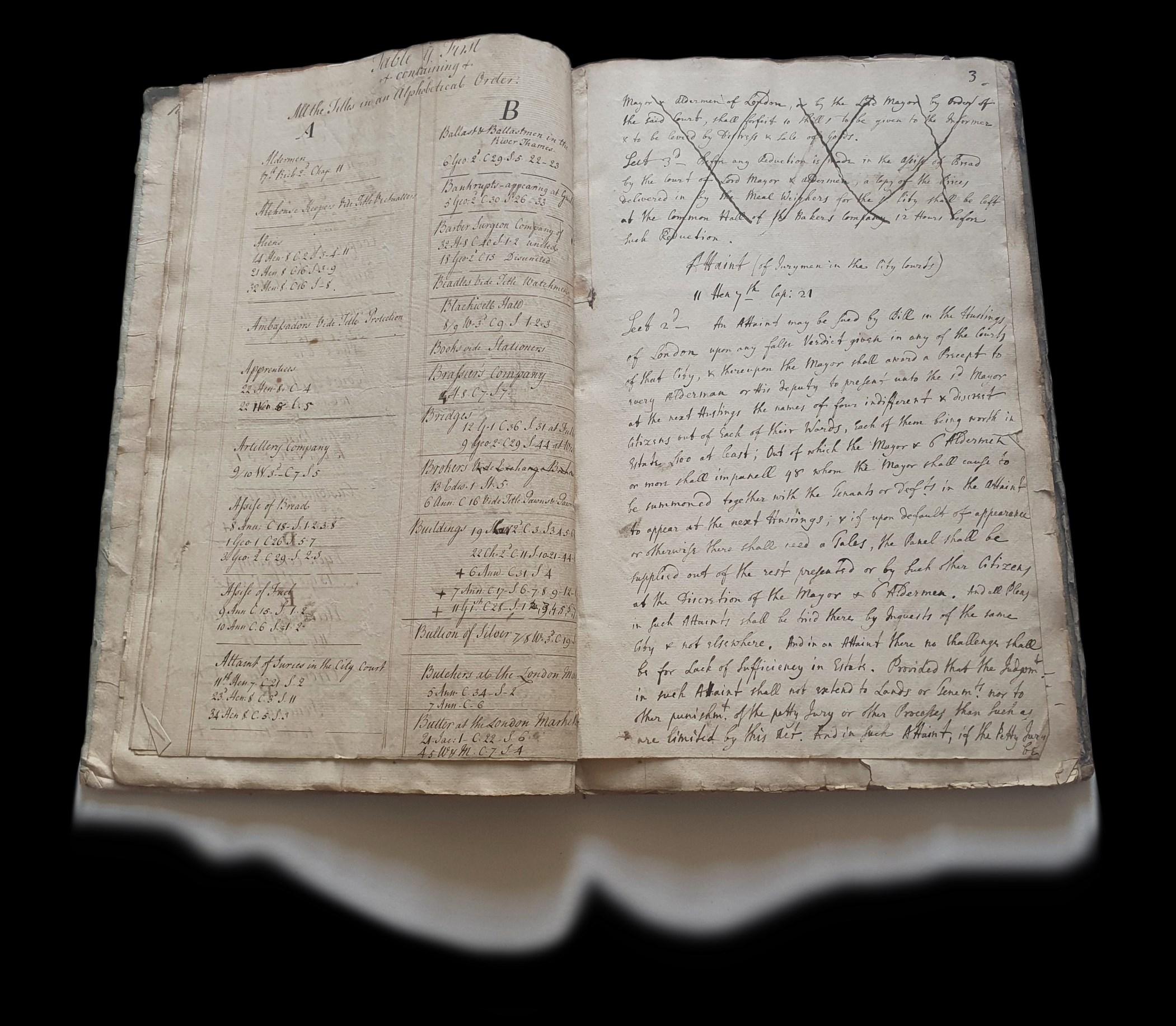 Norman came to me on ye eleventh day of November 1699 I bargained with her to give her for her wages p[er] ann. 06-0000”. The crossings-out probably indicate that Drewe has copied these lines to another volume – illustrating the practice, identified by Adam Smyth, of annotators “shifting material from text to text”4. After further financial record-keeping, he reports: “My Grandmother Drewe dyed on ye 7th of September being Thursday”. A few pages later, he marks a professional milestone: “I was published in ye Temple Hall on ye 9th of feb: 1698/9 […] ye day after I took ye oathes at ye Kings bench”. Money matters soon reassert themselves, with “Expenses for this year”, a tally that self-referentially begins “Almanack – 00-00-10”, then continues with items including “Candles – 00-00-06 / Mending of Jones coat & breeches –00-05-00 [...] my Barristers gown – 06-15-00 [...] a silver headed cane – 01-03-00 / Chocolette 7 pd – 01-01-04” – and a few lines later, perhaps hinting at a sweet tooth, another “8 pd chocolette”.