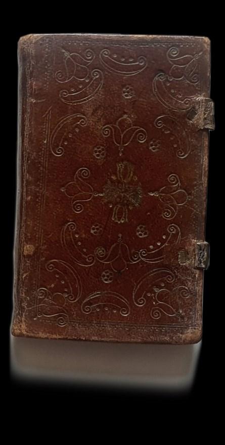 Contemporary calf, very worn, front board detached, fixing to one clasp broken.